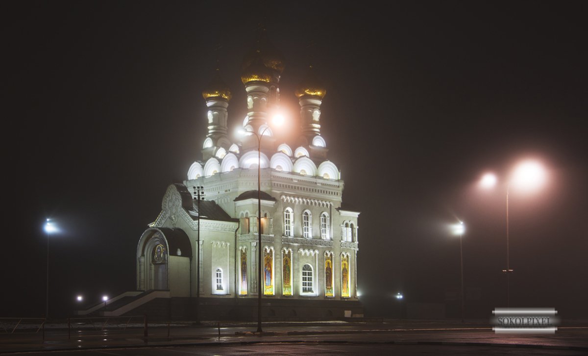 храм,туман,церковь,ночь,фонари,подсветка, Андрей Cоколов