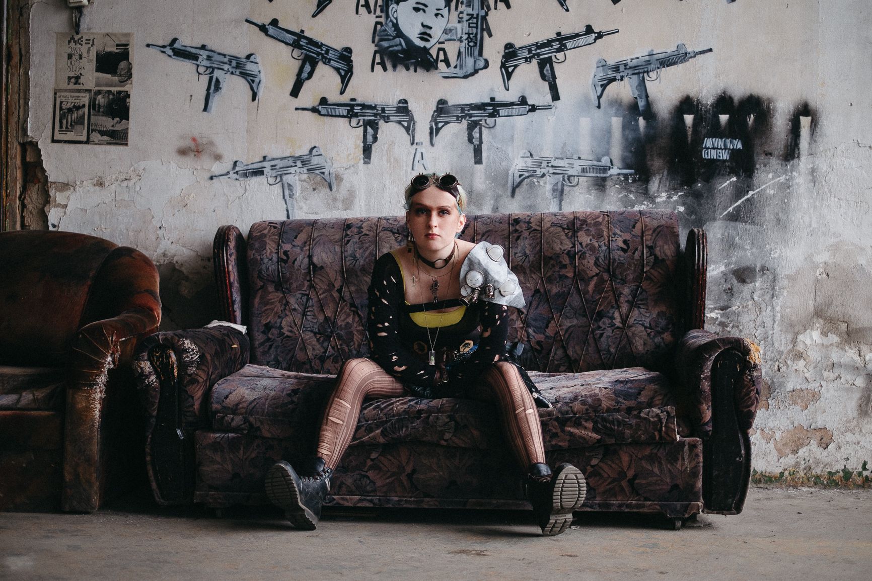 хм. вот видите я про это и говорил, что в съемке людей есть некоторые нюансы. Про толкиенистов, наверное, слышали? Существует весьма внушительная тусовка поклонников жанра "постапа". Например по мотивам к.и. Fallout или совсем из свежего фильм "Безумный Макс". Я ничего на модель не надевал и не изготавливал это ее костюм для отдыха от трудобудней. Требовалось снять. Изначально хотели выйти в песочный карьер и поснимать с импульсным светом, но погода подвела. Пришлось менять планы. Нашли репетиционную базу одной панк группы - отсюда и манекен, диваны и кресла.