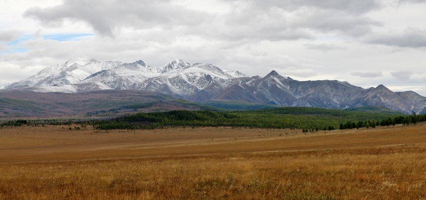 Панорама из пяти вертикальных кадров. Снято с пограничного поста Монды. Вид на юго-восточную часть вершины.