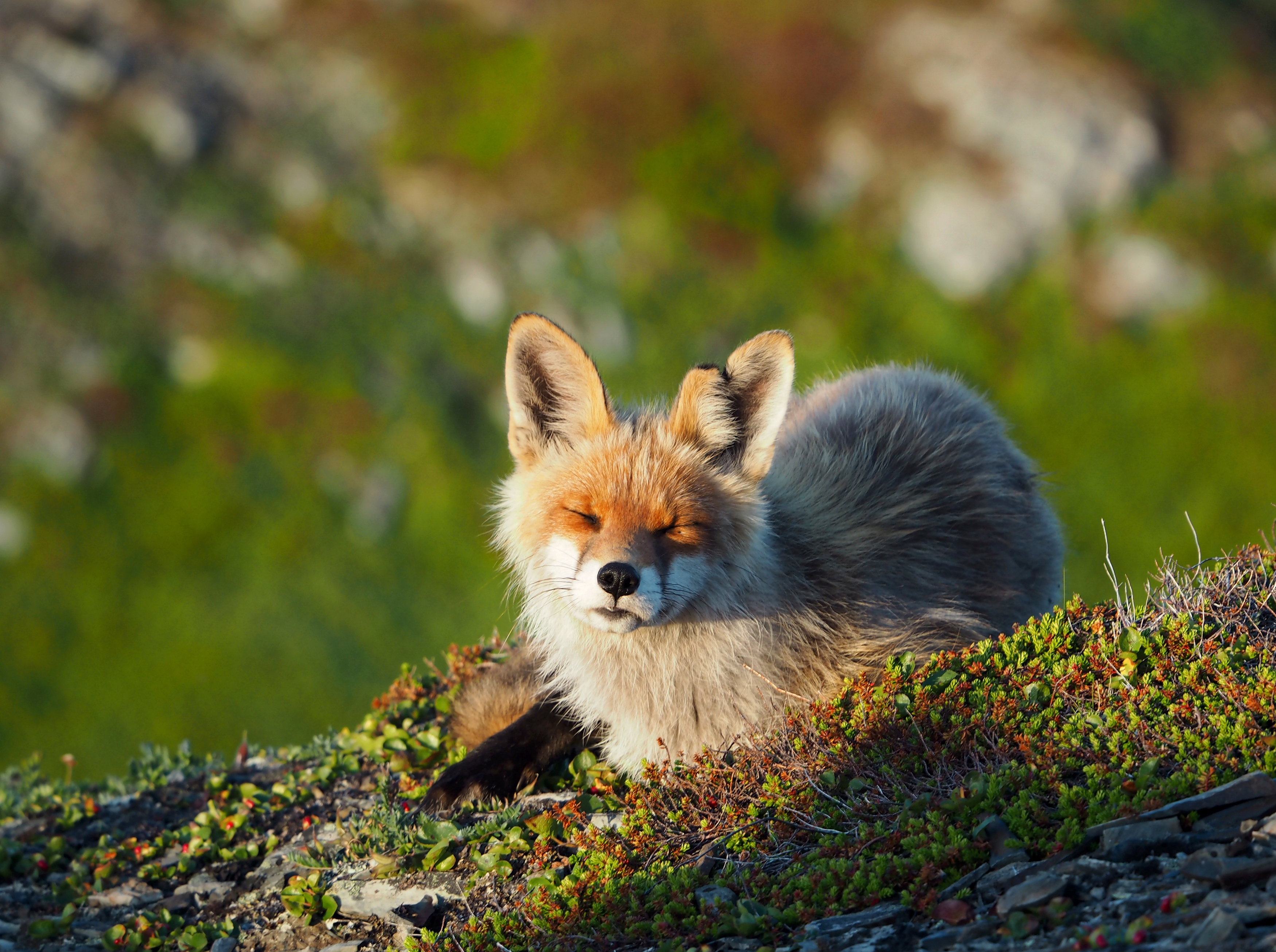 Евгений, эта фотография — как тёплый луч солнца: лиса спокойно устроилась, глаза прикрыты, будто наслаждается моментом. Свет мягкий, фон размыт — всё это создаёт ощущение уюта и тишины, хотя и не называю это словом.