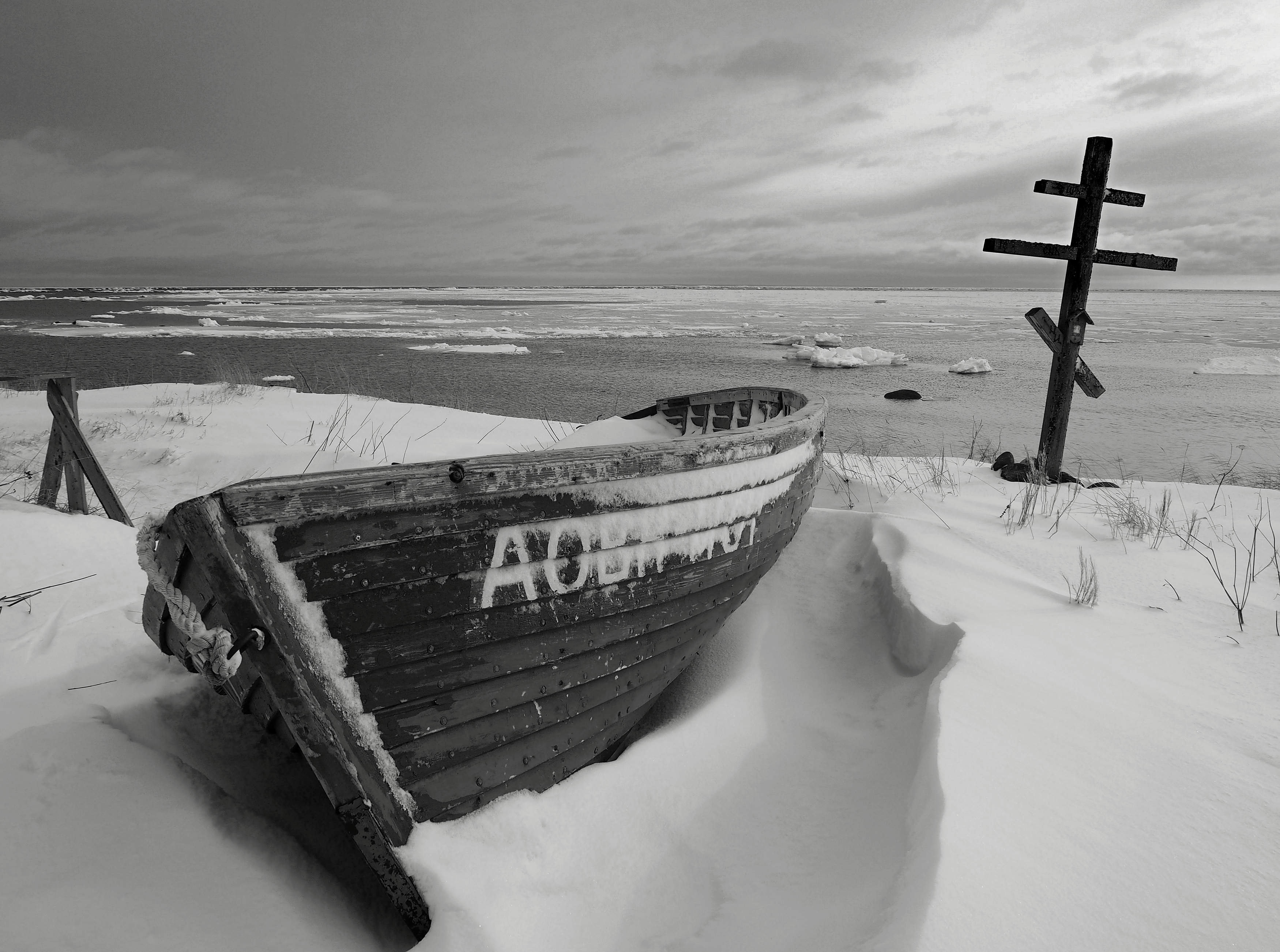 Евгений, снимок сильный — контраст, композиция, атмосфера. Лодка и крест на снегу — как символы, но без навязчивого смысла. Хорошо передаёт холод и одиночество. Классно.