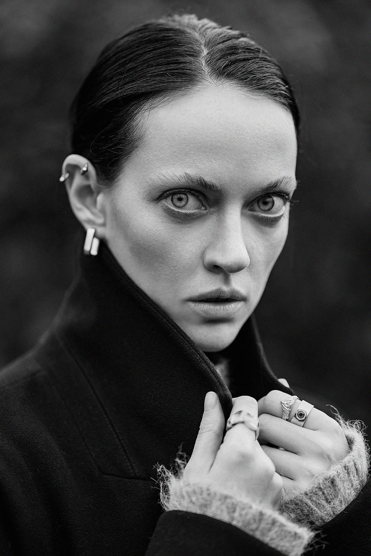 Портрет Екатерины, снятый в монохромной гамме, передает глубину и напряженность взгляда. Собранная прическа, темный плащ и аксессуары на руках и ушах создают образ современной женщины с внутренним напряжением. Фотография отражает атмосферу загадочности и эмоциональной силы, характерную для авторского стиля Сосновских Вячеслава.