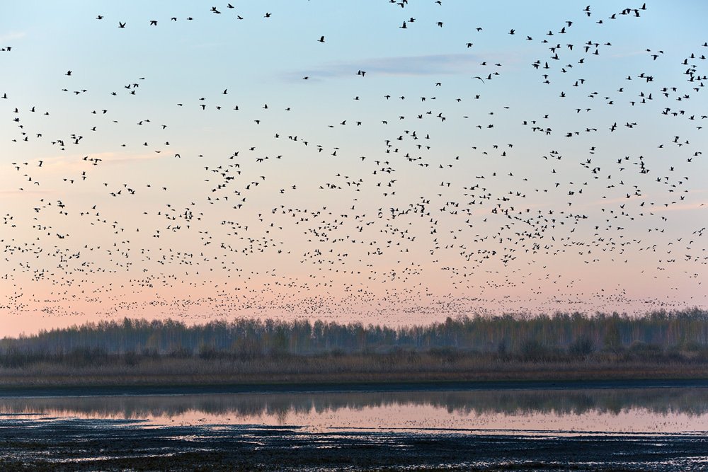 Михаил,когда они взлетали с воды перед рассветом,то если не видеть этого,а просто слушать,можно было сильно испугаться создаваемого шума.Тысячи крыльев,разрезающие воздух.