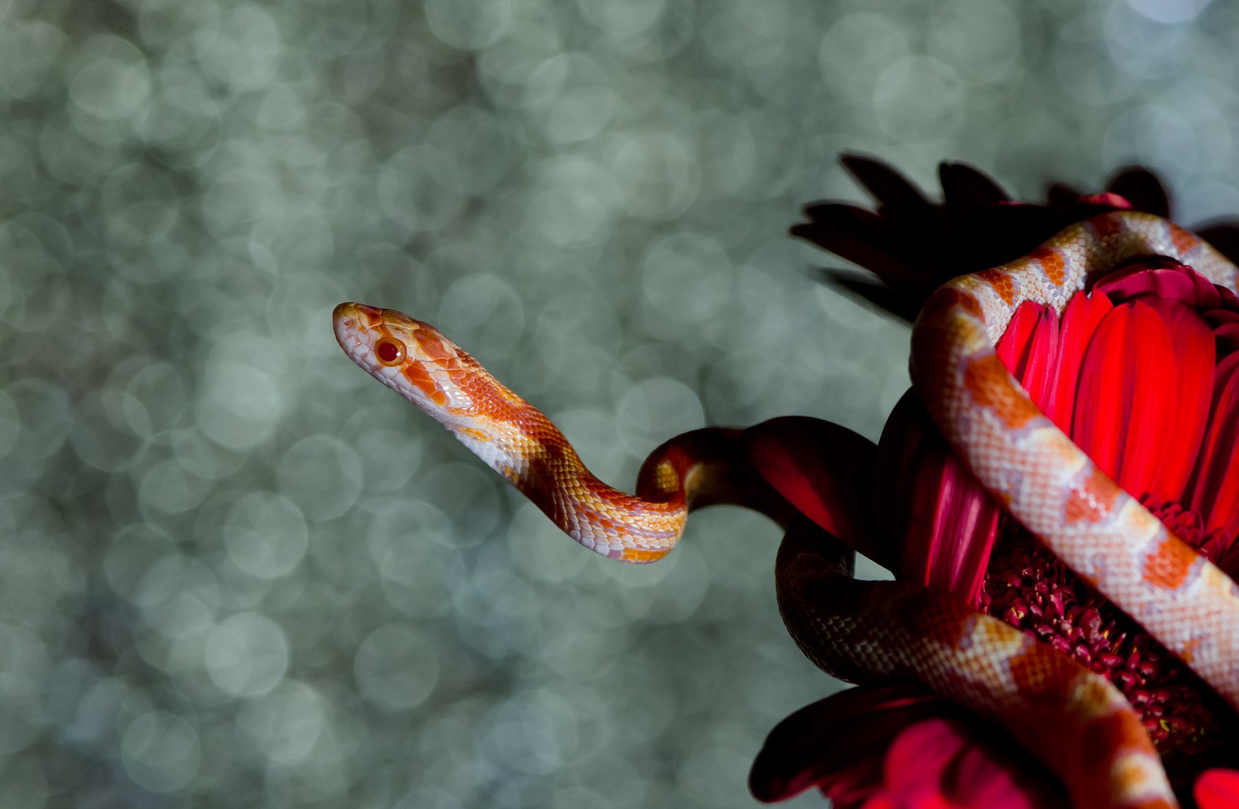 боке, блики, змея, маисовый полоз, питомец, рептилия, пресмыкающееся, цветок, изгибы, линии, красный, зелёный, Ксения Соварцева