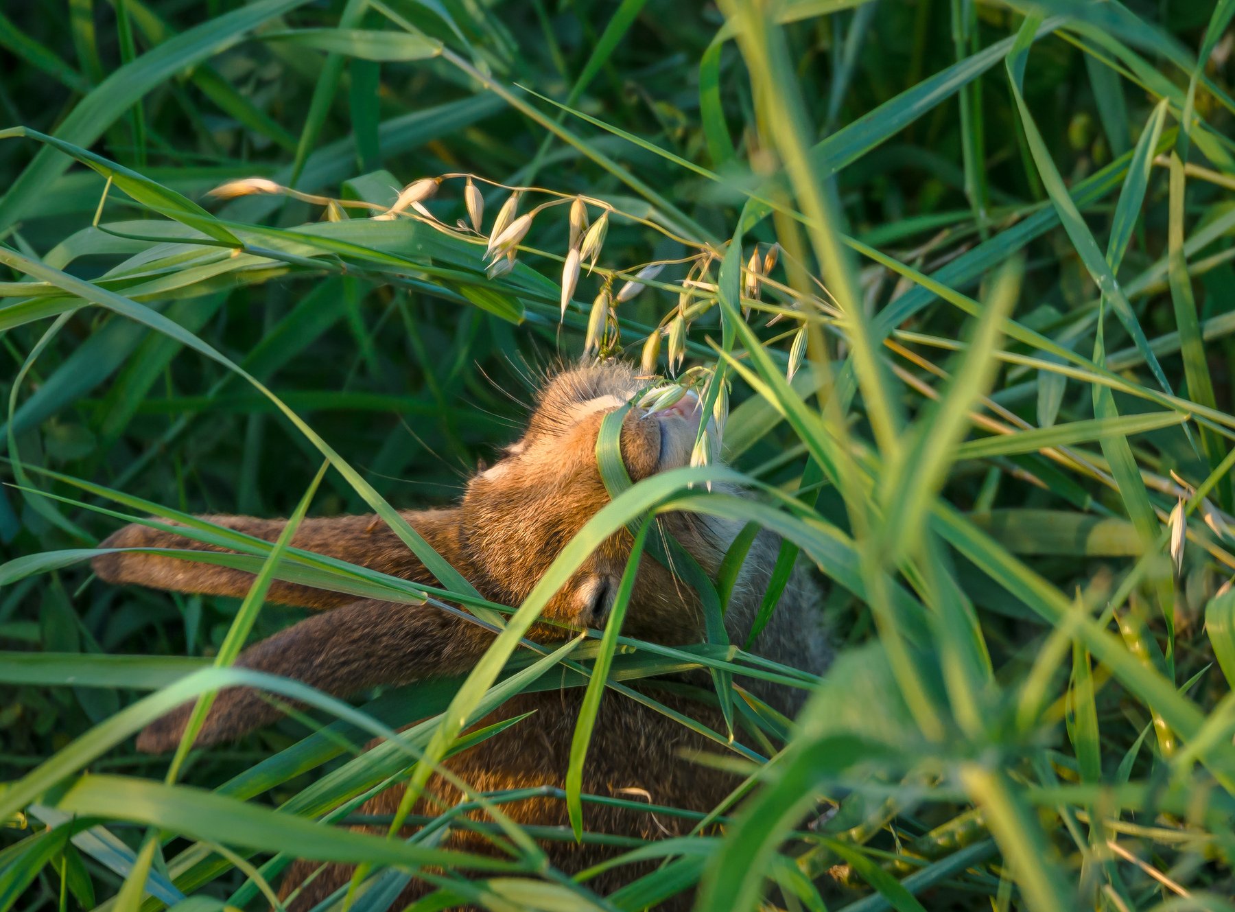 заяц, овёс, овсы, цлгз, заповедник, центрально-лесной, с высоты, зелёный, зелень, трава, злаки, питание, дикая природа, лето, август, Тверская область, млекопитающее, беляк, Lepus timidus, Ксения Соварцева
