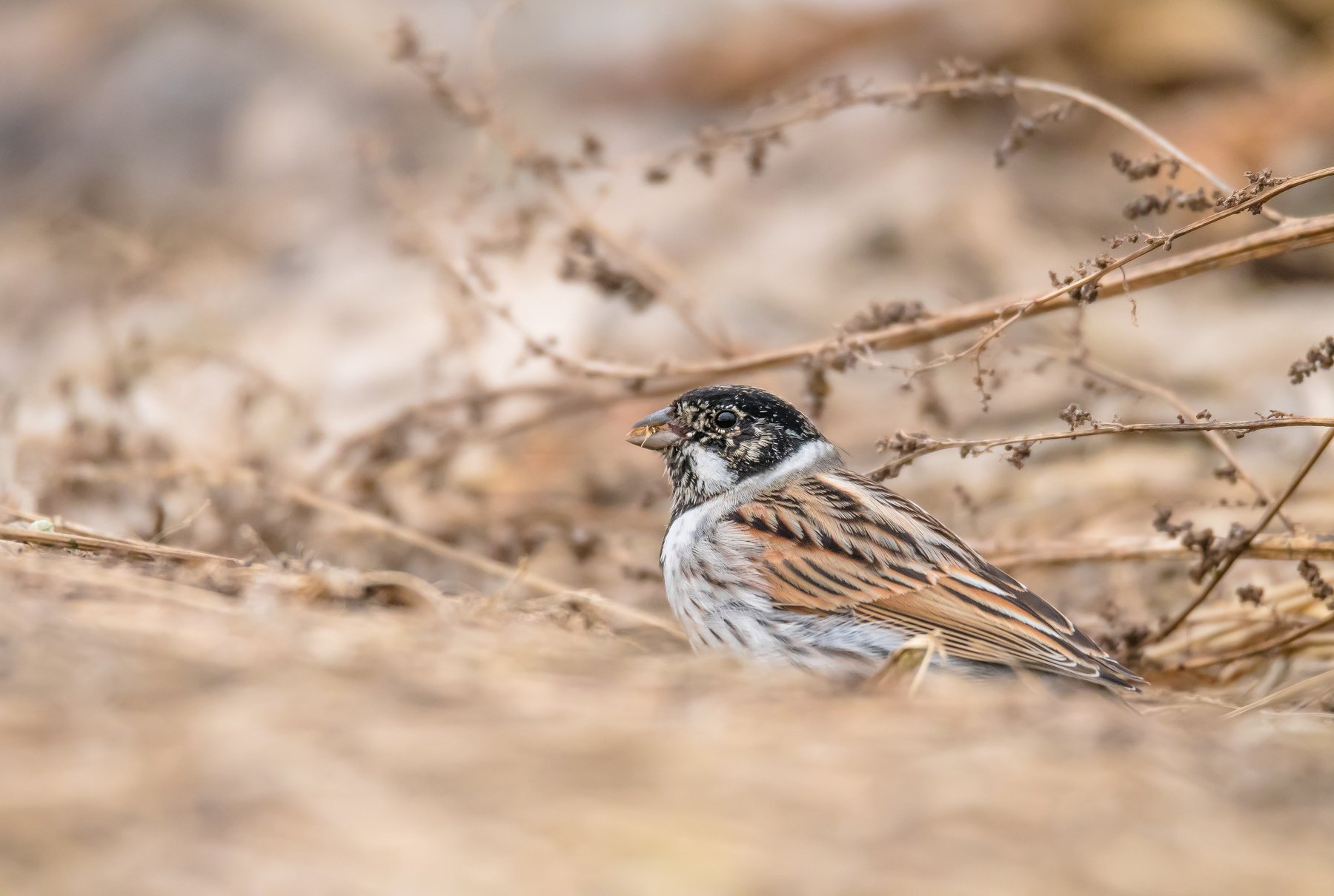 Тростниковые овсянки едят без перерыва после перелёта (семена полыни и мари), чтобы вернуть массу, поэтому можно подойти довольно близко на открытом пространстве