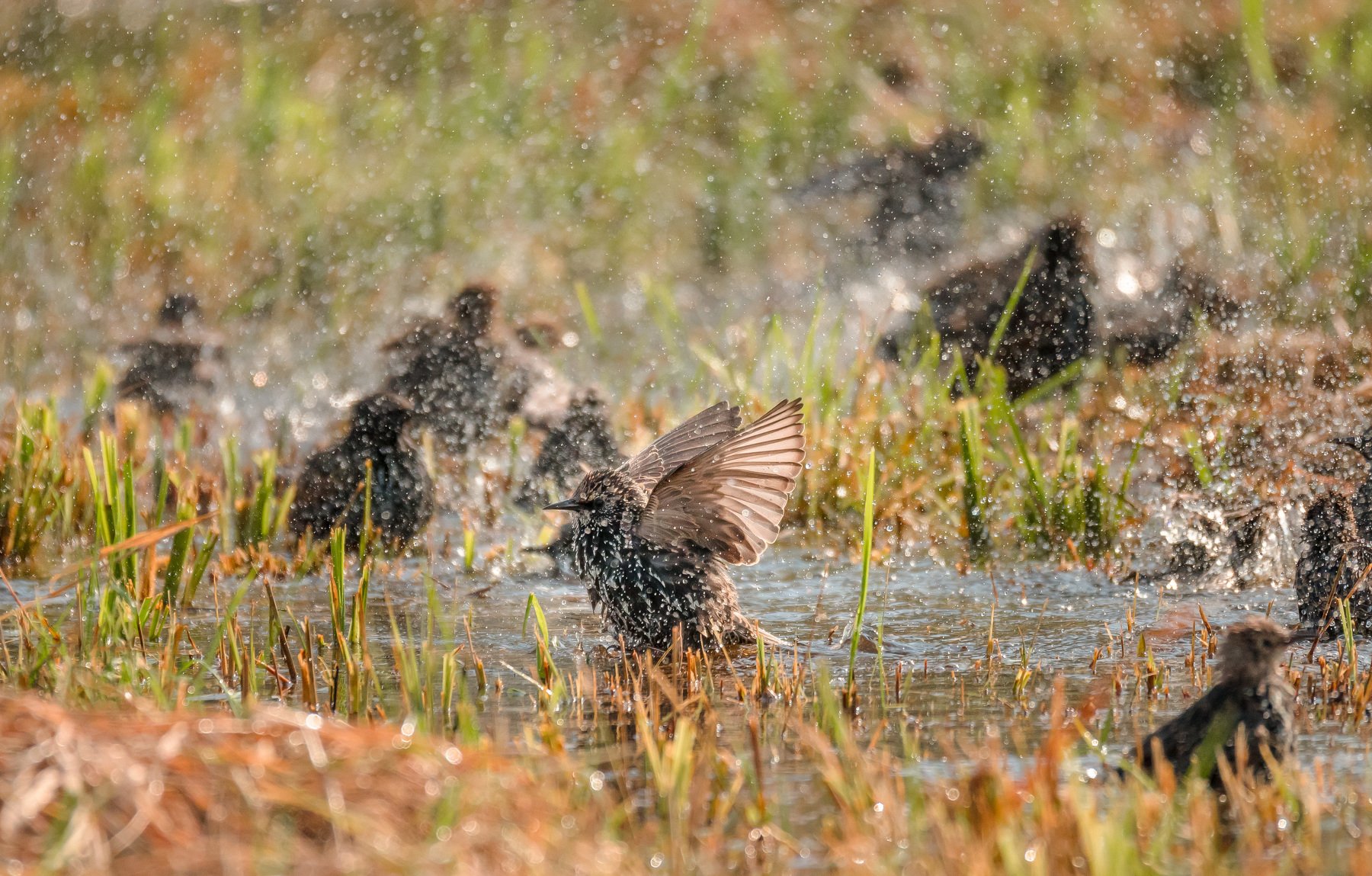 Интересная ситуация, когда есть птицы, их много, они купаются в воде, летят брызги, но снять их толком не выходит, автофокусировка в таких условиях отказывает в контровом свете, брызги сбивают с толку, даже в ручном режиме не понятно что где и на чём остановить фокус. Только когда стало поспокойнее и часть птиц улетела, удавлось сделать несколько кадров.