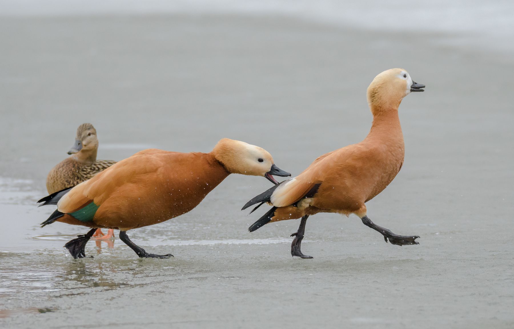 Огари на прудах у Главного ботсада Москвы. На последнем самец пристаёт к самке