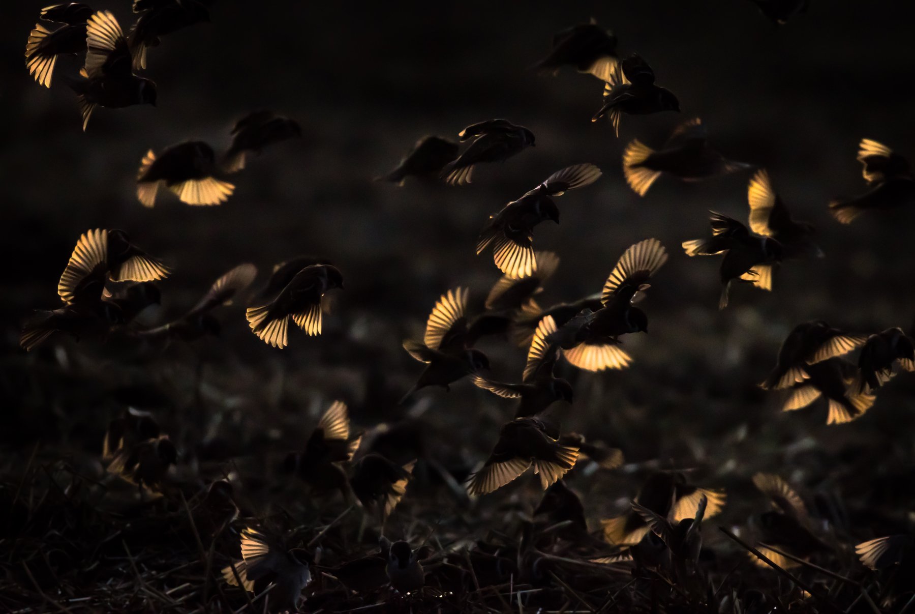 полевые воробьи, Passer montanus, стая птиц, контровый свет, декабрь, бесснежная зима, птицы зимой, полевые птицы, крылья птиц, птицы в полёте, много птиц, Ксения Соварцева