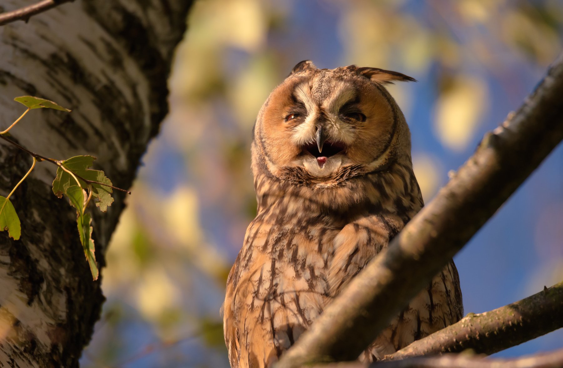 Создаётся стойкое впечатление, что совушка смеётся, но на самом деле она срыгивает погадку. Ушастые совы удивительно эмоциональные птицы, если успеть заметить момент