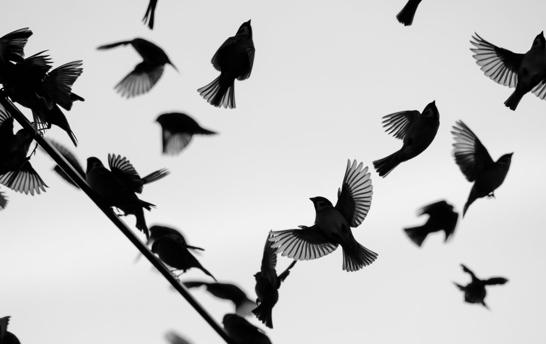 Большая стайка полевых воробьёв в поле бесснежной зимой кормится различными семенами трав, периодически вся стая срывается на провода высоковольтной линии неподалёку, а затем снова пикирует на поле