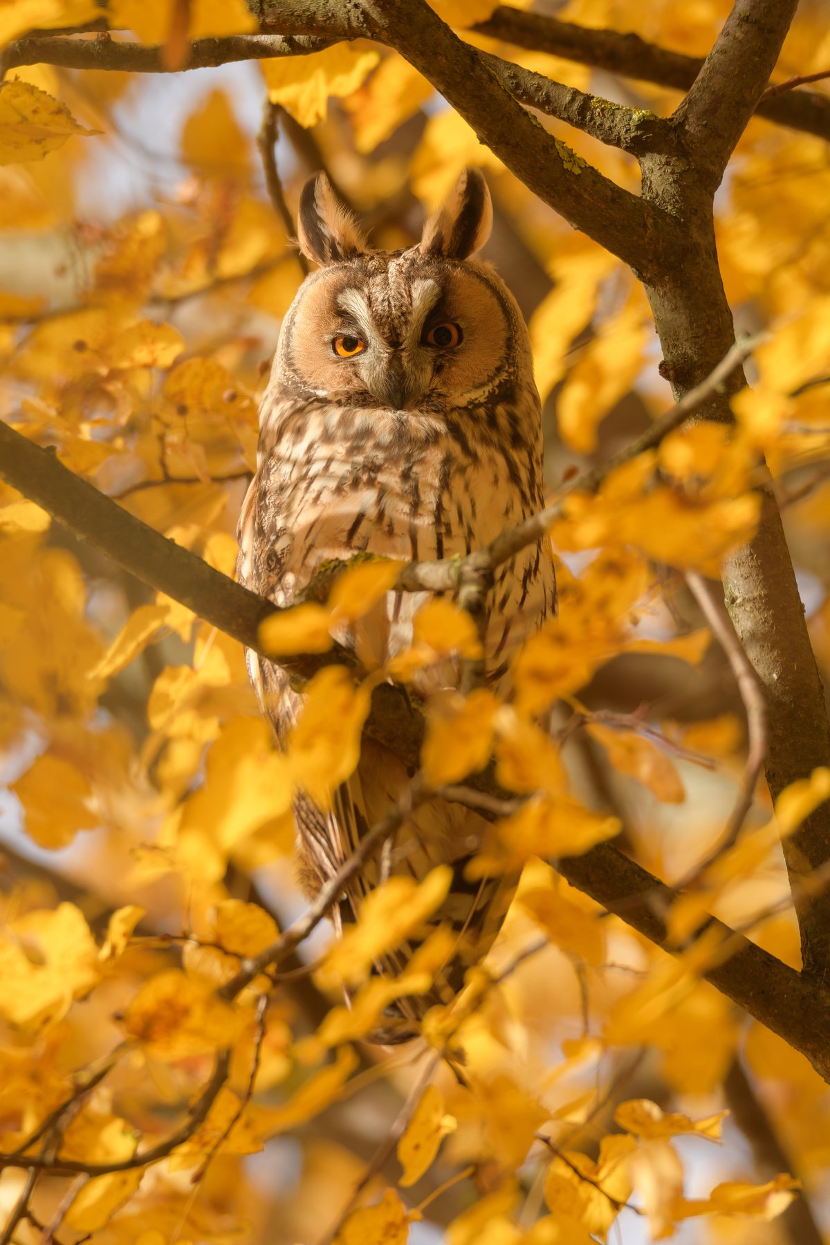 Ушастая сова хорошо сливается с большей частью своего окружения, то она невидима на фоне ствола берёзы, а вот она растворилась в листве осенней липы, если не знать, что она там, запросто пройдёшь мимо