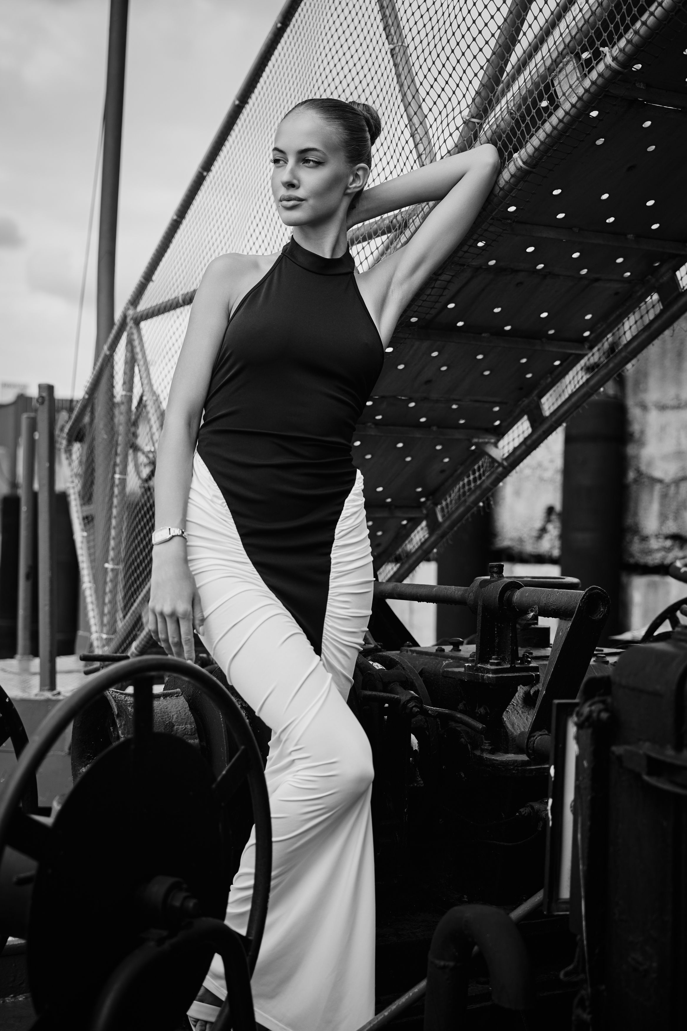 Черно-белое изображение демонстрирует контраст между утонченной женственностью и суровой промышленной средой. Модель в модном наряде уверенно позирует рядом с массивными механизмами, создавая визуально впечатляющий образ.