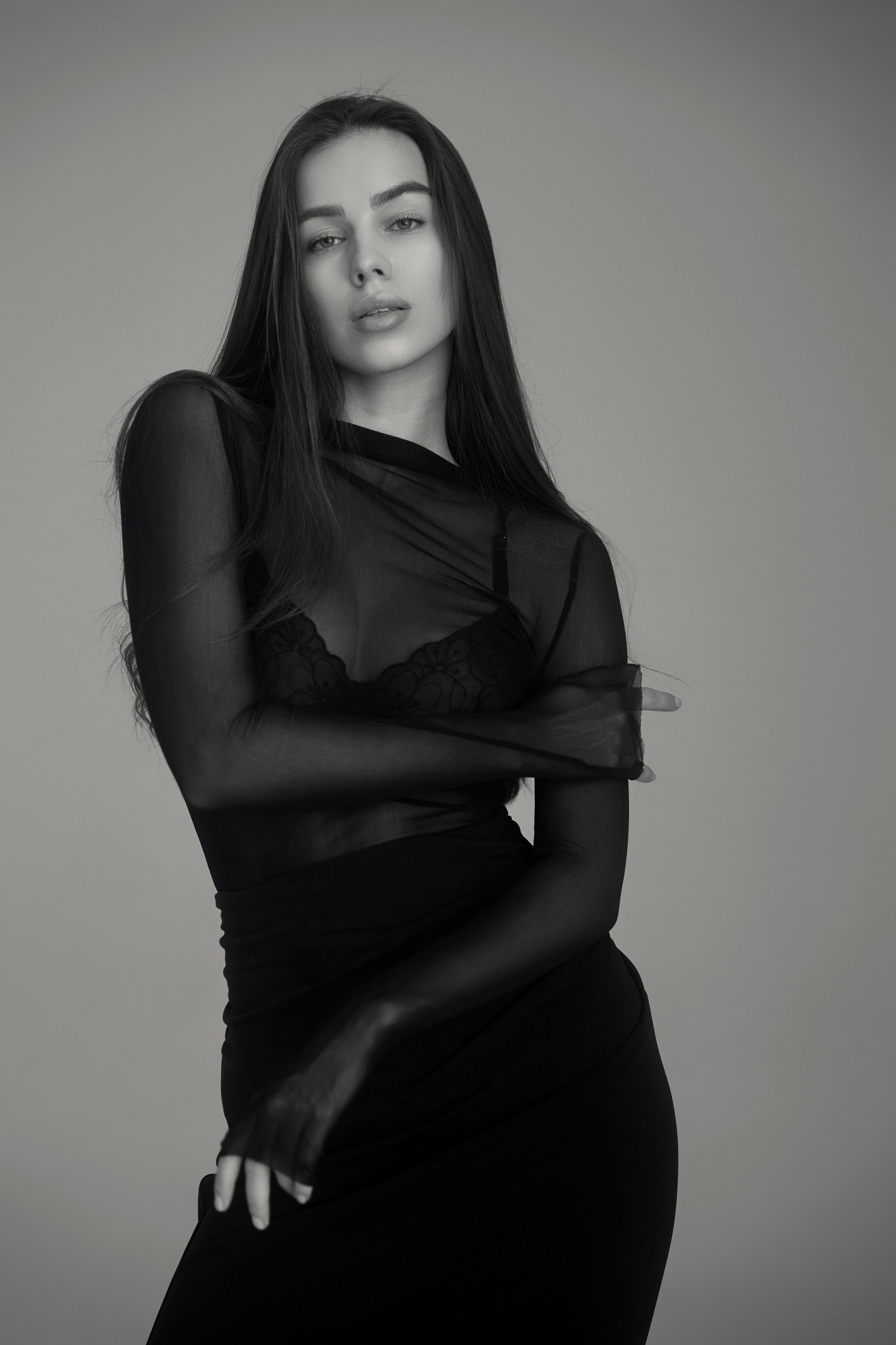 Снимок сдержан и чёткий. Чёрно-белая гамма подчёркивает силуэт и текстуру ткани. Поза — уверенная, взгляд — прямой. Есть пространство для восприятия, без лишнего шума. Можно чуть сильнее подчеркнуть контраст — визуально это добавит глубины. Хорошо сделано.