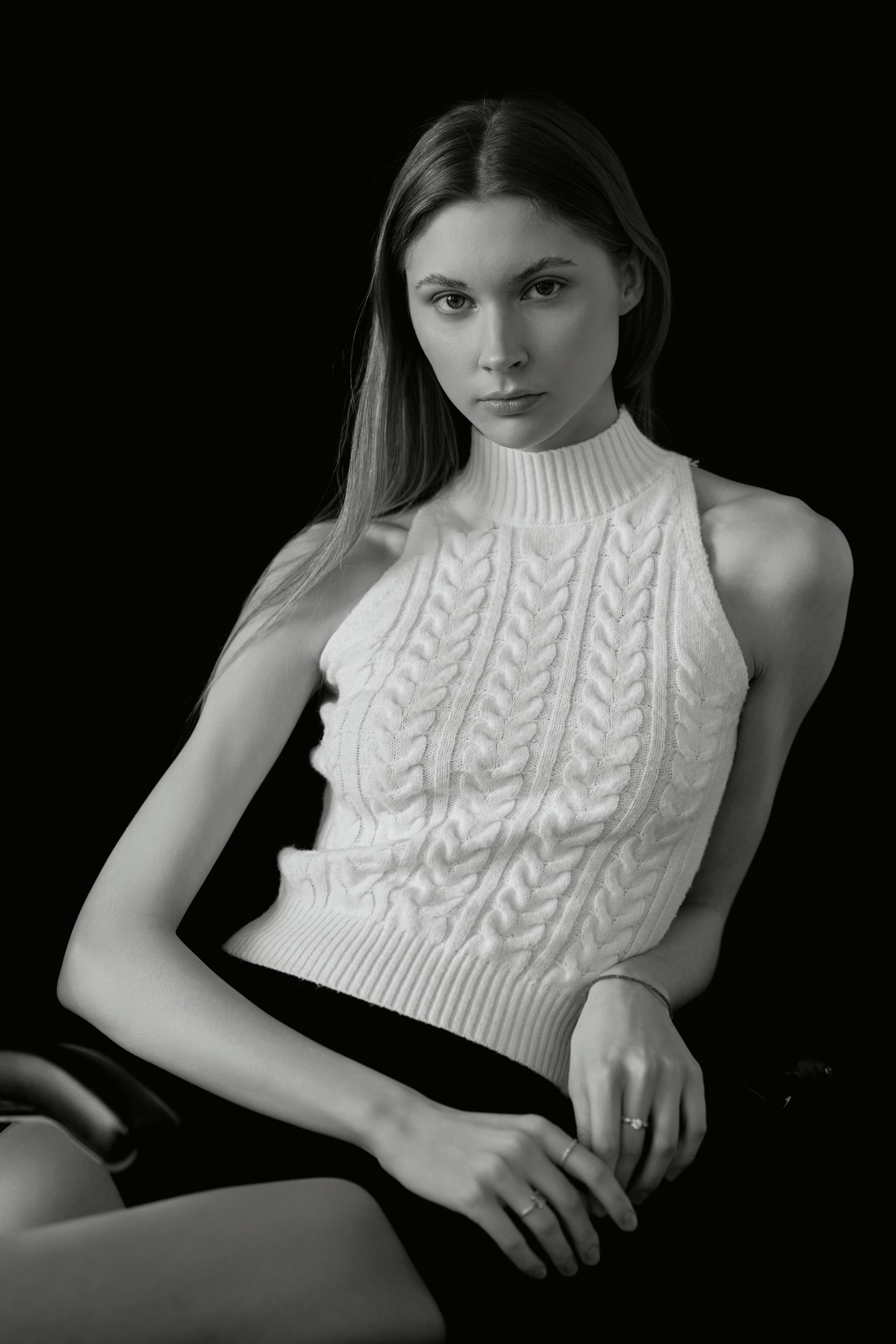 Сильный свет, чёткий контраст — Вы хорошо вывели текстуру вязки и форму тела. Глаза смотрят прямо, это создаёт контакт. 💬