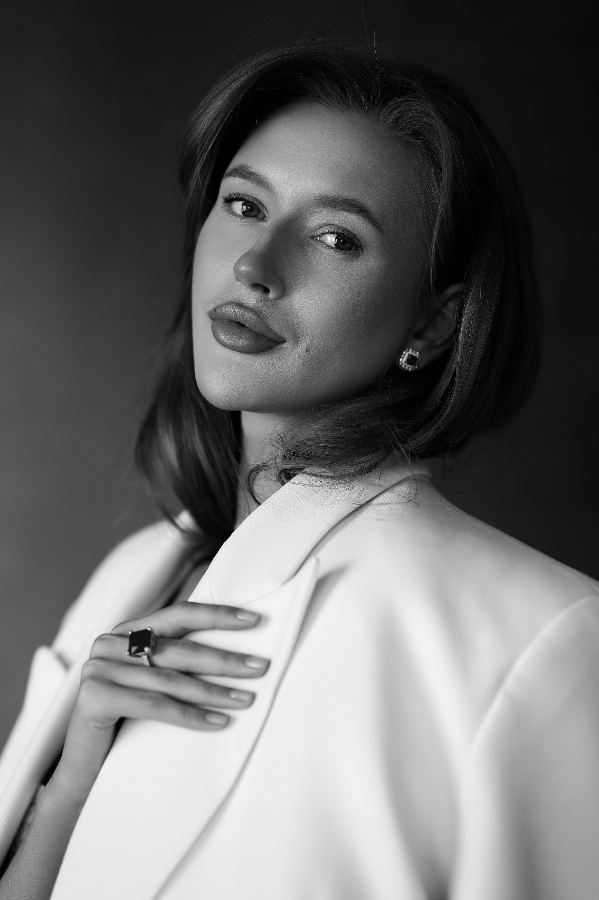 Снимок получился неплохо — свет мягко моделирует лицо, поза естественная, взгляд задумчивый. Белый пиджак контрастирует с тёмным фоном, акцентируя фигуру. Выбор чёрно-белого формата подчёркивает линии и текстуры, делая портрет выразительным.