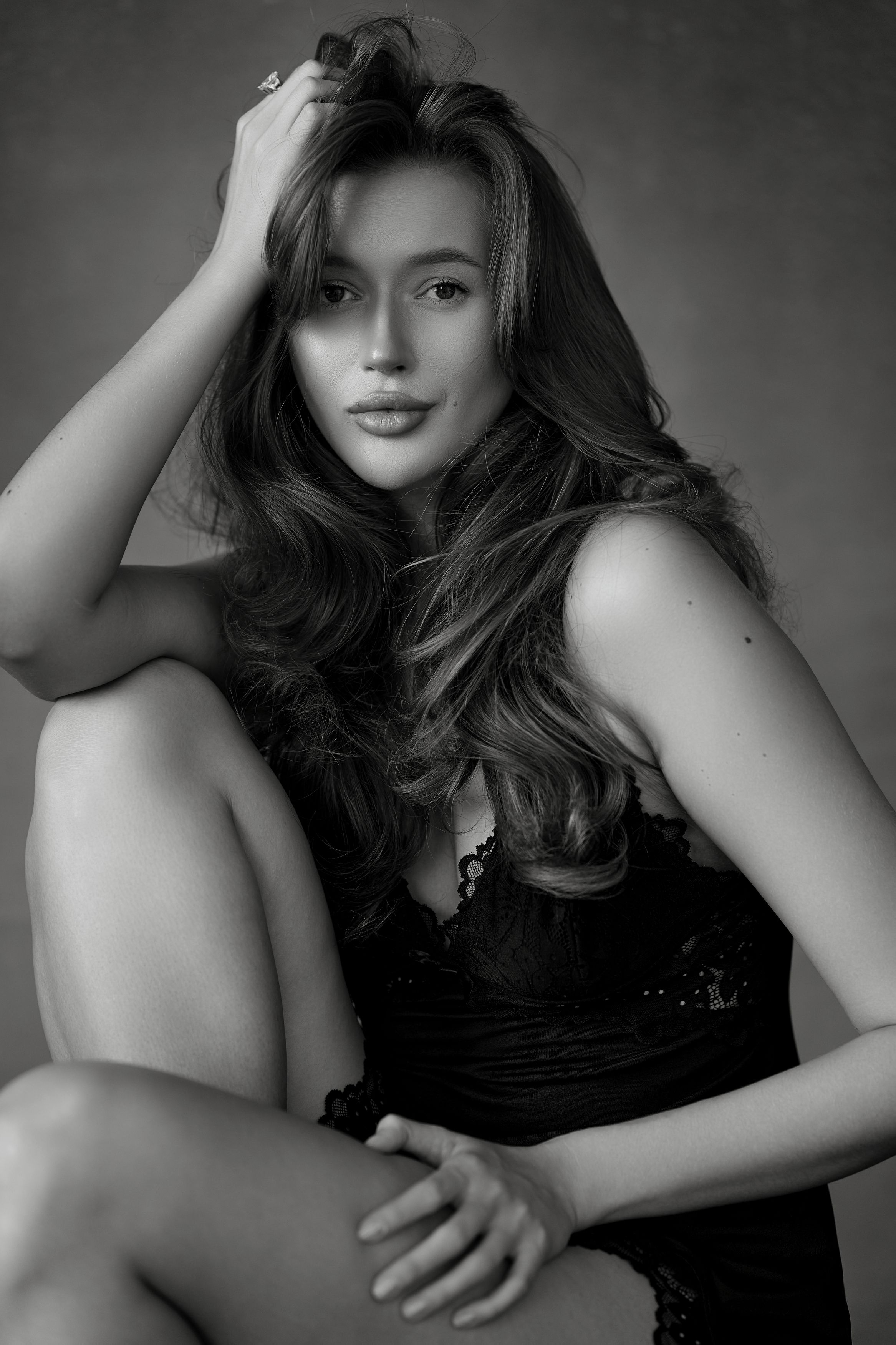 Этот снимок демонстрирует мастерство работы со светом и тенями. Модель позирует с естественной грацией, создавая атмосферу интимности и утонченной красоты.