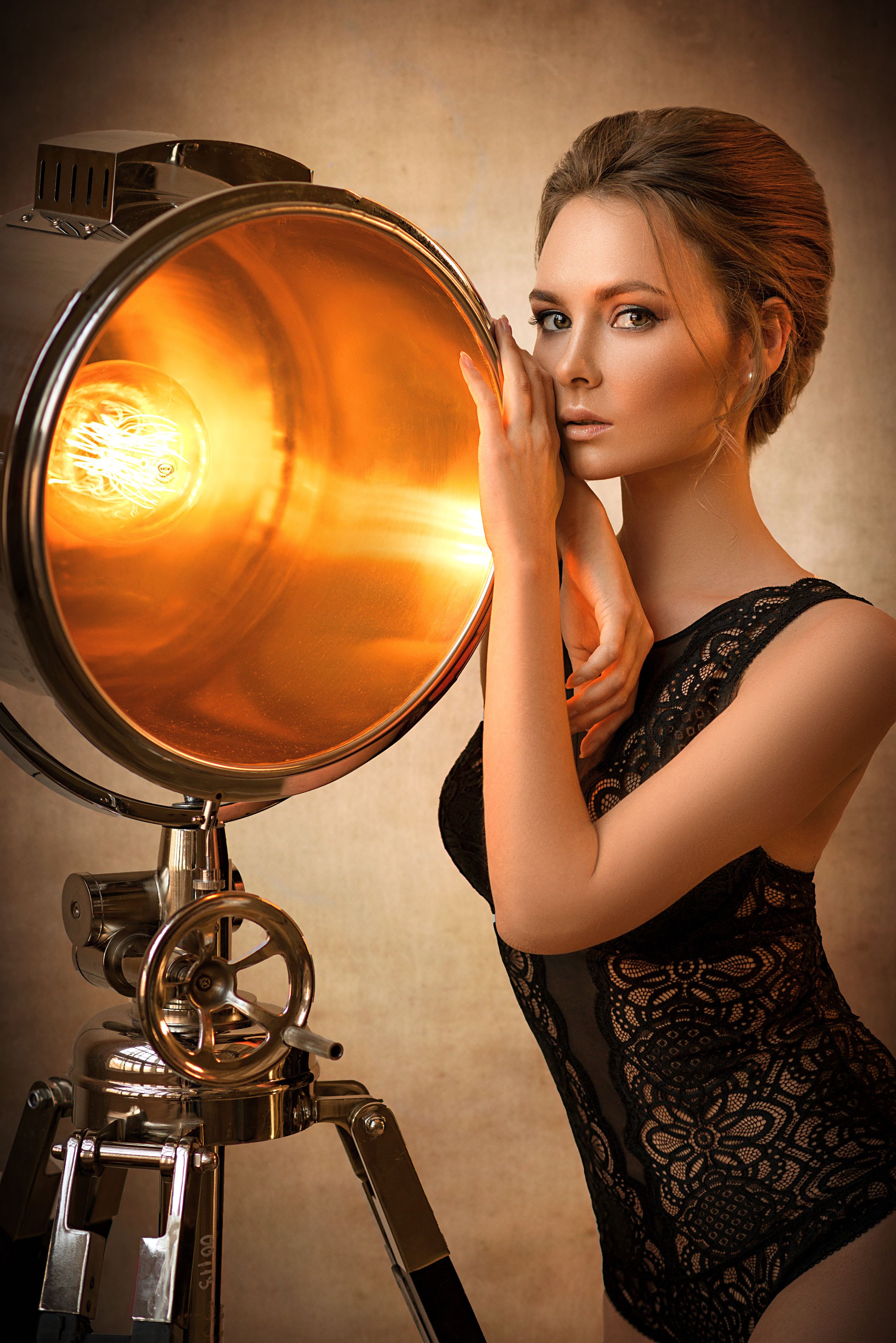 В студии, под ярким светом старинного прожектора, модель в элегантном черном кружевном наряде позирует с выразительным взглядом. Свет от лампы создает глубокие тени и акцентирует черты лица, придавая снимку драматичность и профессионализм. Композиция сочетает элементы классического портрета и современной фотостудии. Фотограф Максимов Станислав передает атмосферу творческого процесса — свет, тень, поза и эмоция.