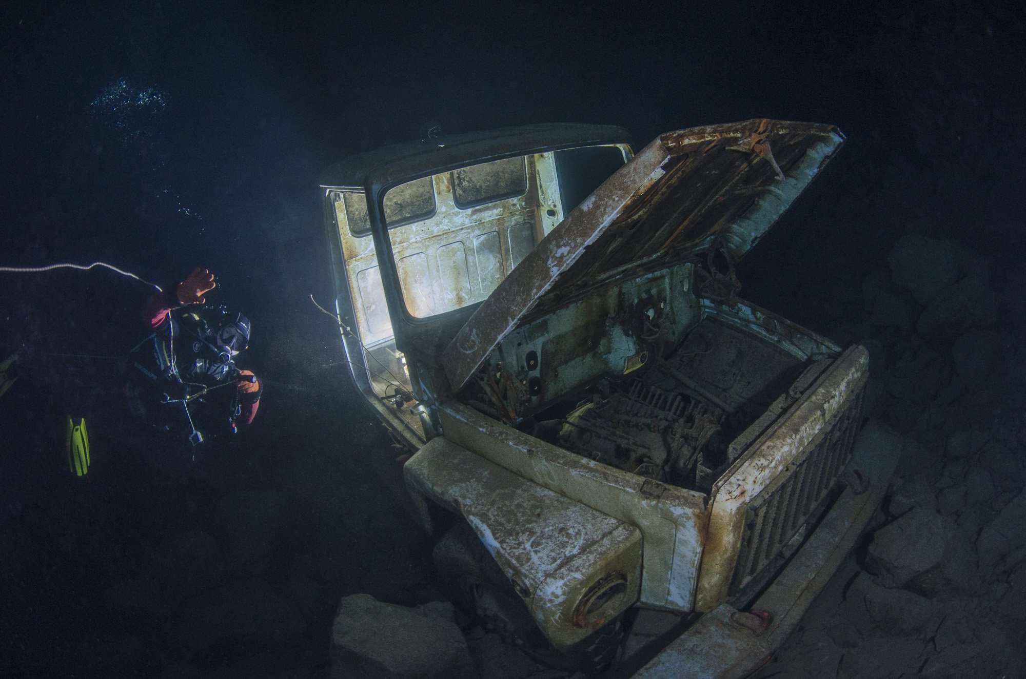 Это в затопленном железорудном карьере в районе поселка Темир-Тау, Кемеровской области. Грузовик, судя по всему, был затоплен специально много лет назад.