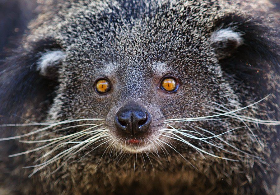 Хвост бинтуронга – это мускулистая «пятая лапа». 3 фута в длину и с клочком голой коже на кончике для хватания, точь-в-точь как у обезьян, хотя эволюционировали эти млекопитающие порознь. Как и обезьяна, бинтуронг пользуется хвостом, чтобы доставать пропитание и свисать с ветвей. Хвост этот настолько сильный, что бинтуронг может спускаться по стволу головой вперед и передвигаться по ветвям вверх тормашками, добираясь до труднодоступных плодов.