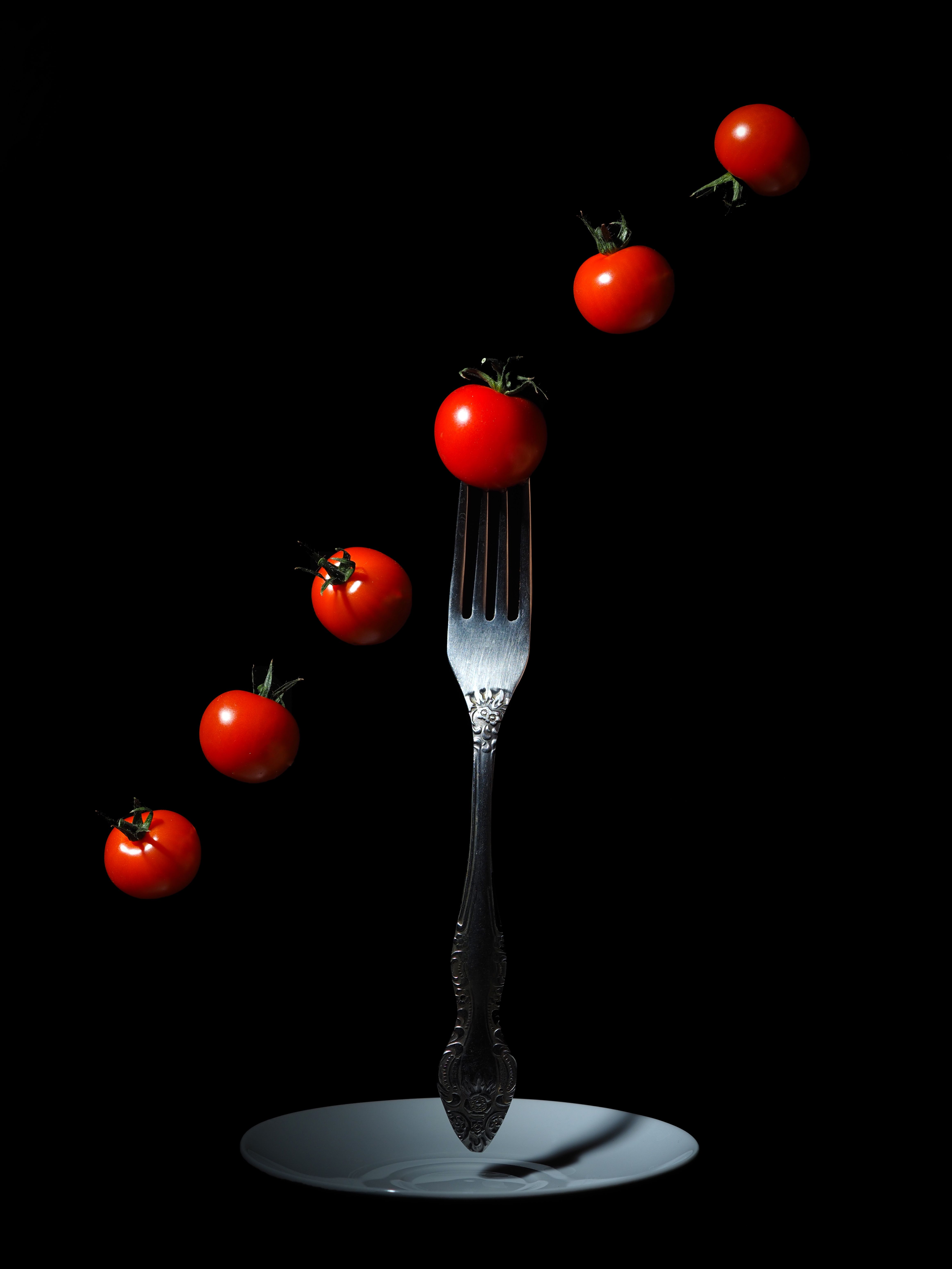 помидора, черри, вилка, левитация, черный, натюрморт, минимализм, Сергей Калёв