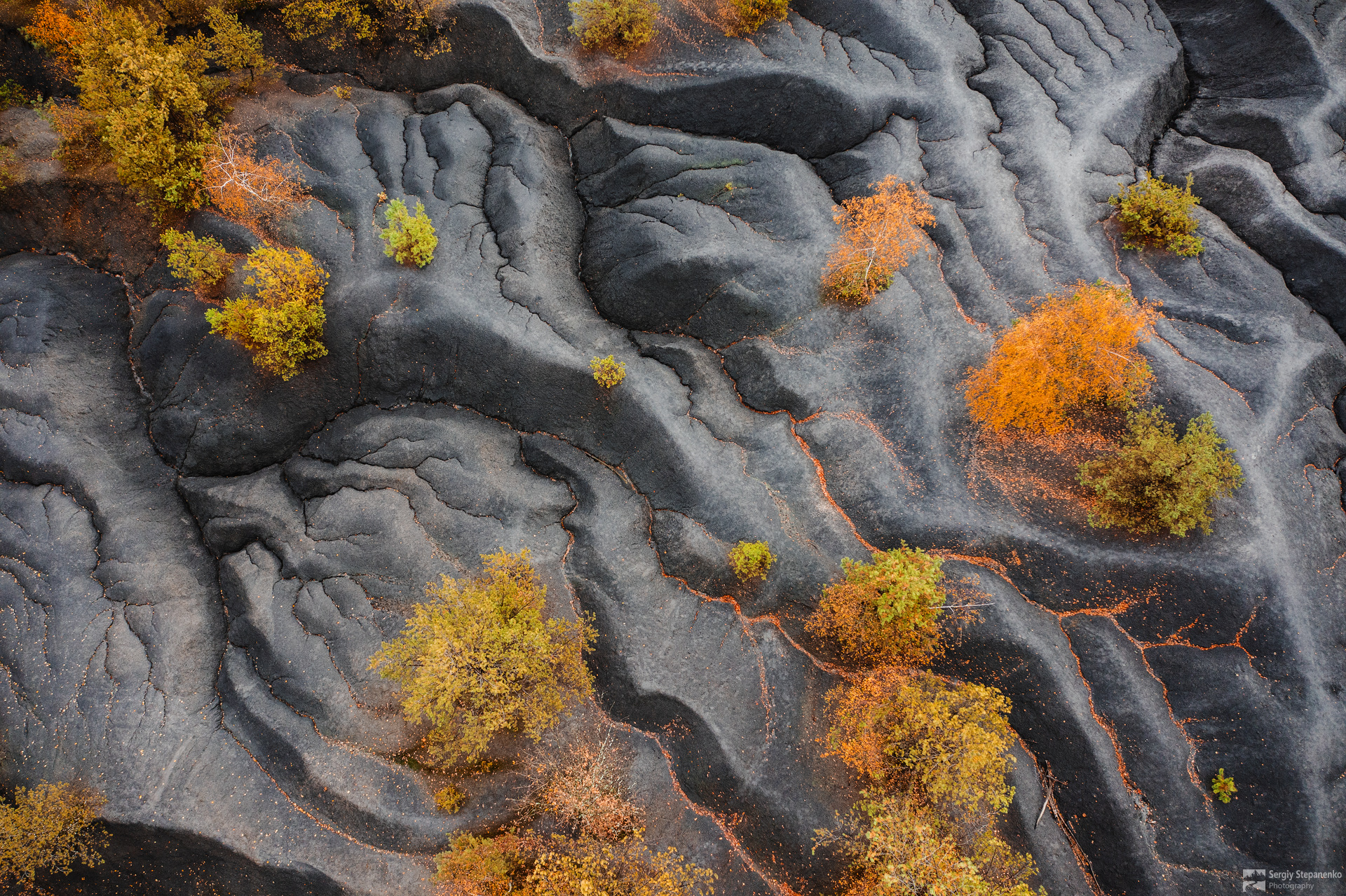 This is a powerful aerial view — the dark, cracked earth feels almost lunar, carved by time and water. The autumn trees, scattered like fire in the stone, add warmth without overwhelming the mood. The contrast is striking, but not forced. The composition holds you — it’s both raw and beautiful.