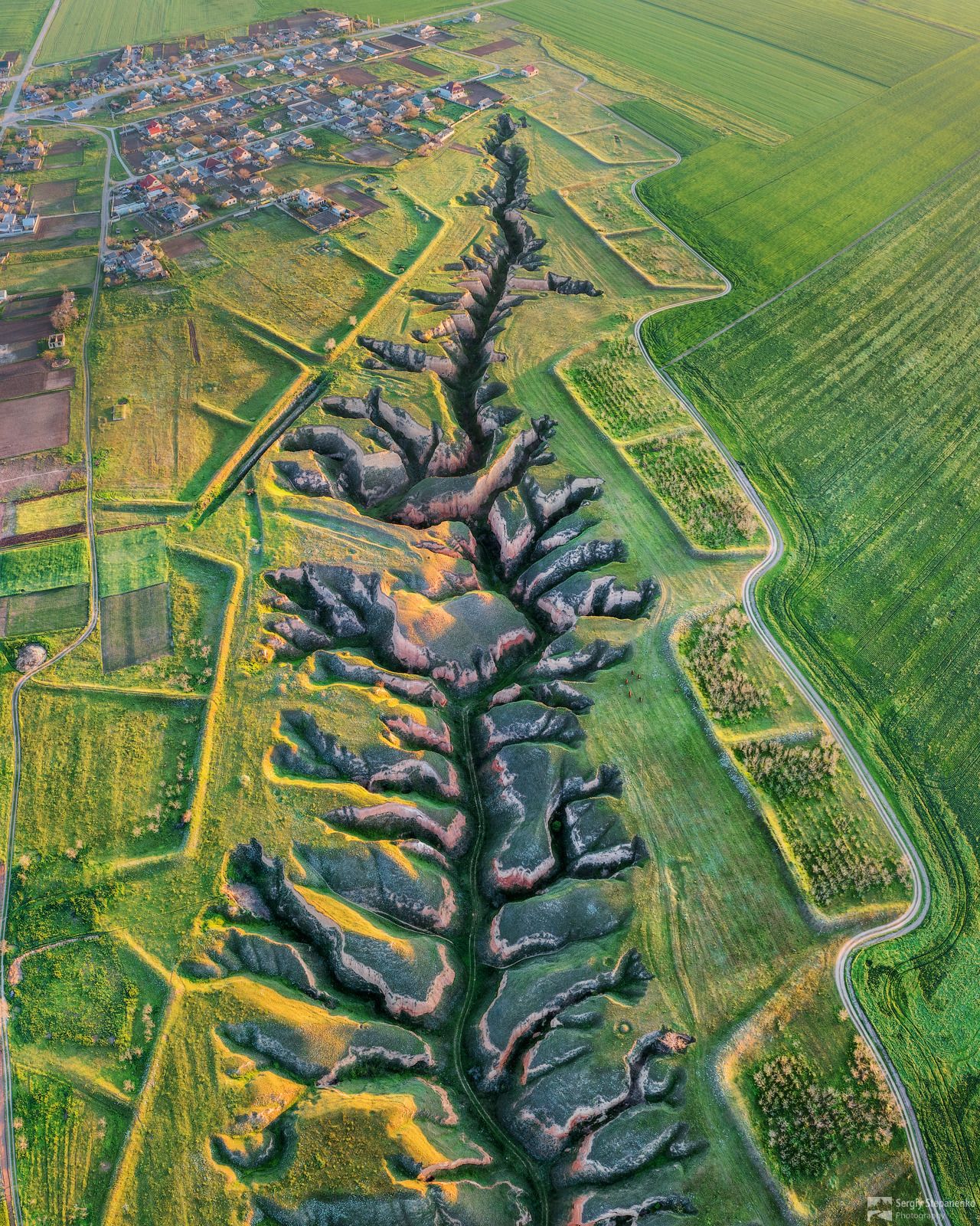 На снимке запечатлены живописные сельскохозяйственные угодья с извилистыми руслами рек, образующими сложные геометрические паттерны. Зелёные и желтоватые тона полей контрастируют с тёмными линиями воды, создавая эффект фрактальной симметрии. Этот вид сверху подчеркивает гармонию между человеком и природой, демонстрируя красоту сельского ландшафта в период весеннего пробуждения.
