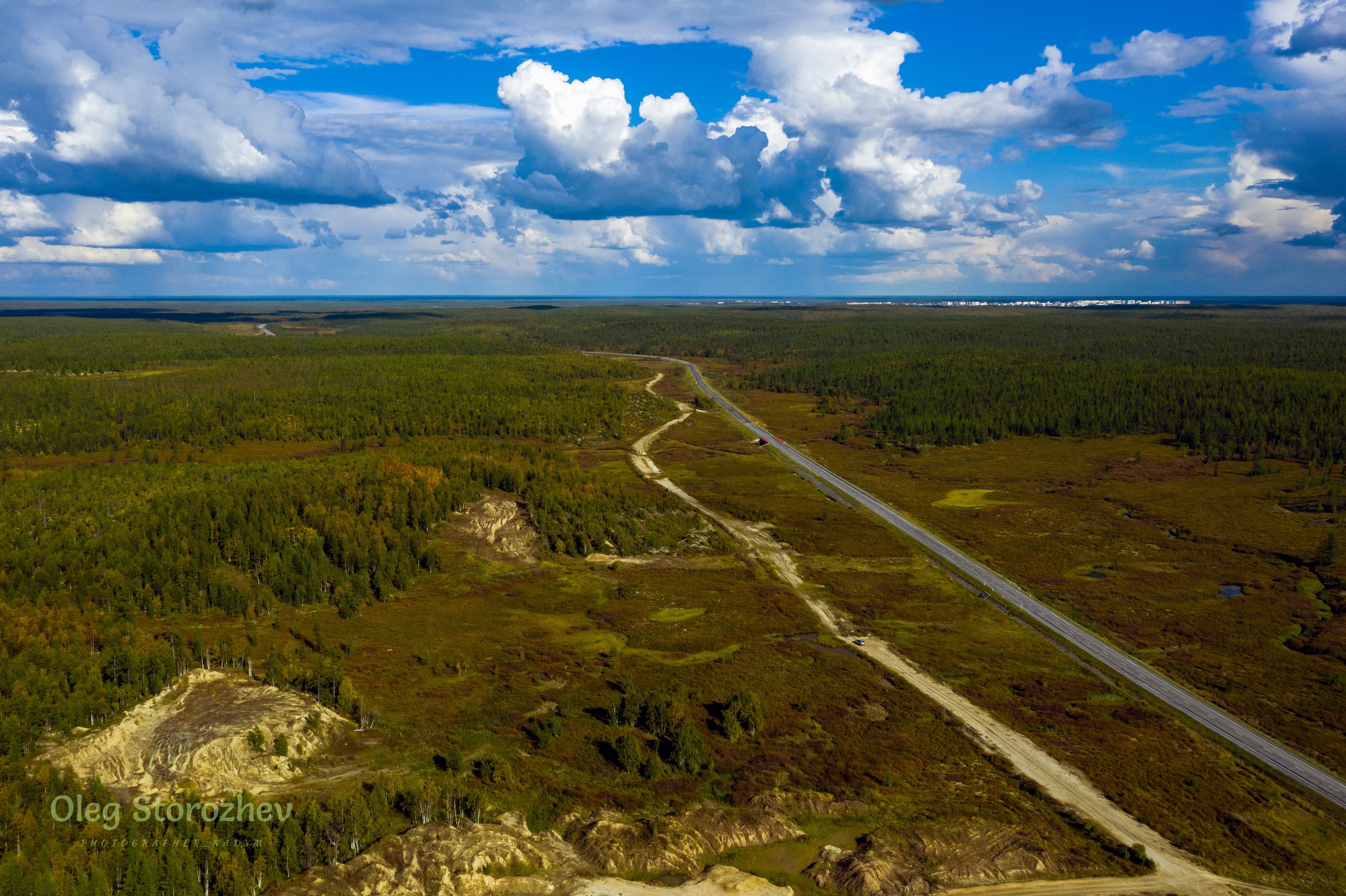 дорога, тундра, болото, город, небо, Сторожев Олег