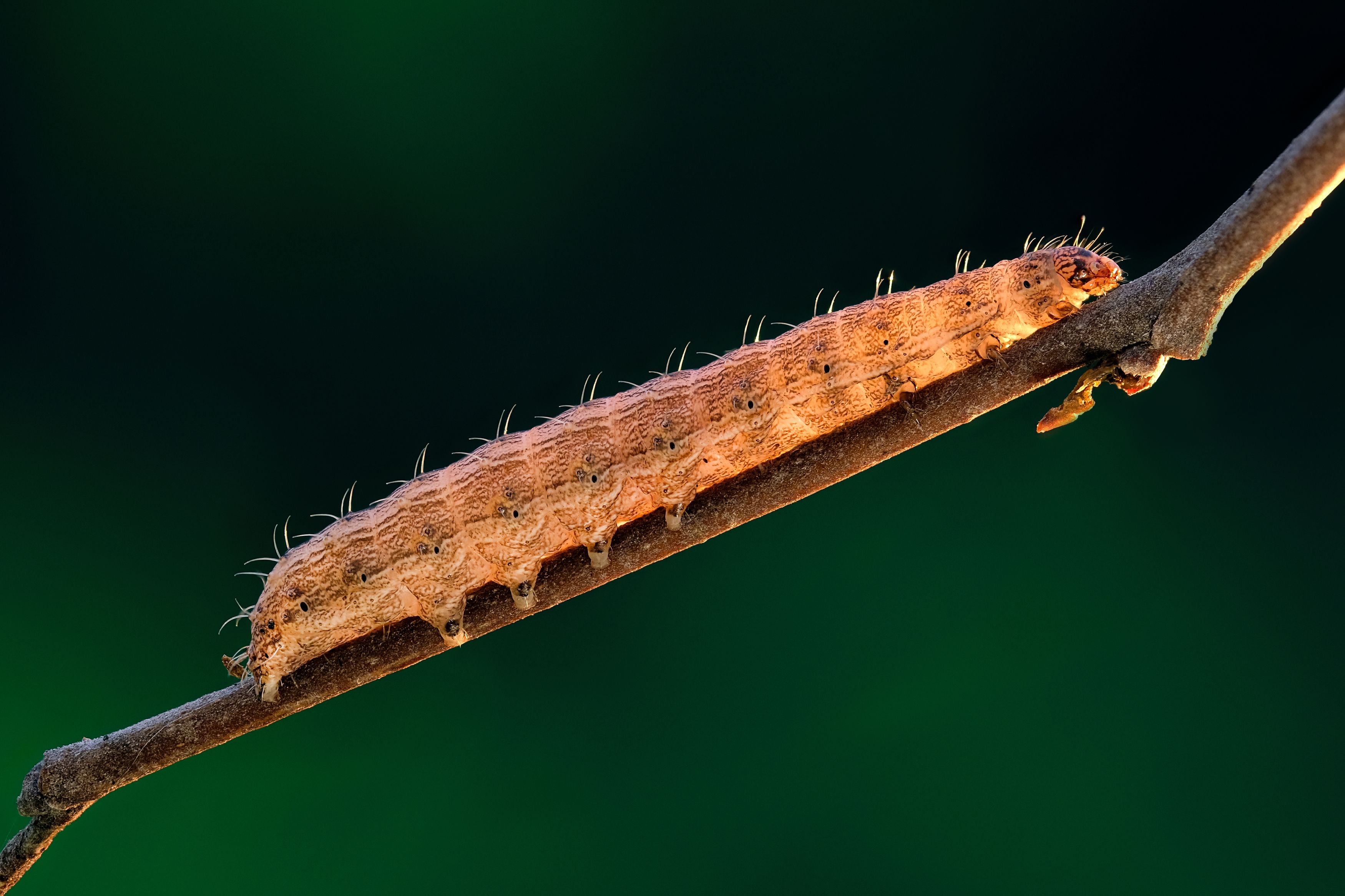 Свет падает точно туда, где нужно — на гладкую шероховатую кожу гусеницы, на её мелкие щетинки, на сухую ветку. Зелёный фон — как природа, не мешающая, но присутствующая. Просто и чётко. 🌿