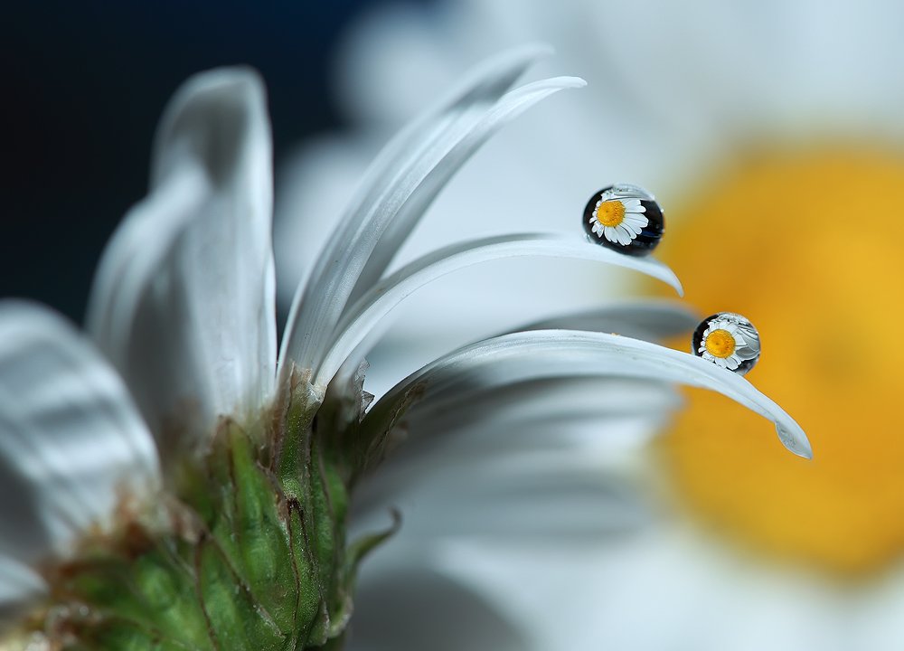 Отражение ромашки в каплях воды. Снято одним кадром, без монтажа в ФШ.
