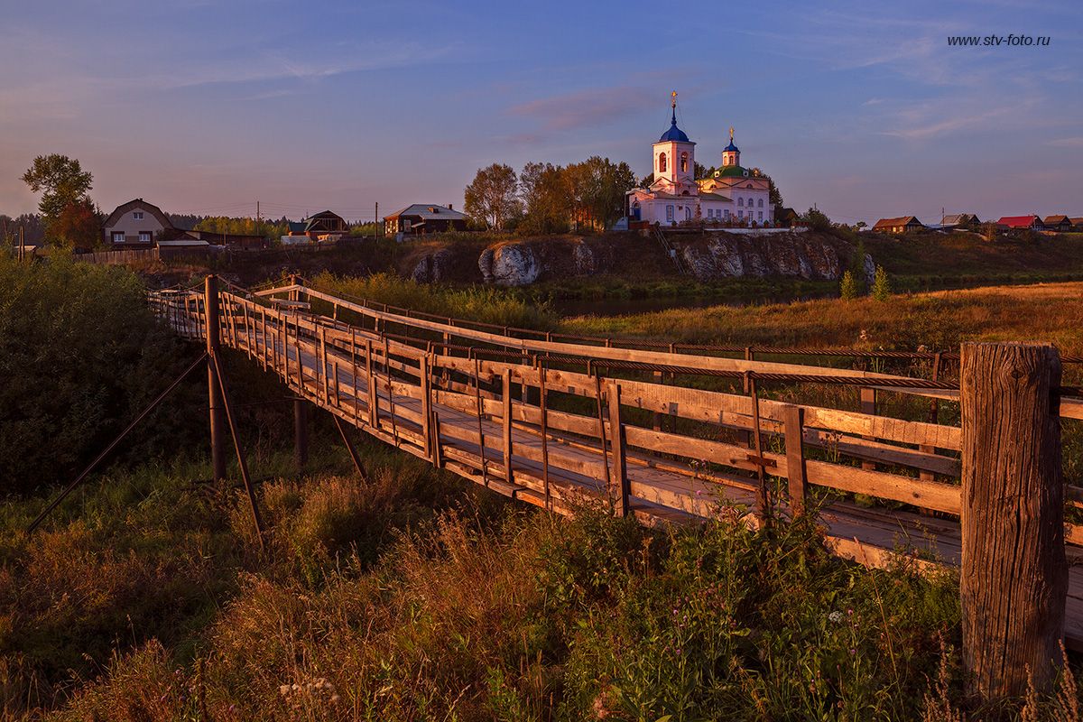 Основными достопримечательностями этого симпатичного села являются Храм Георгия Победоносца и деревянный мостик, соединяющий берега Чусовой.