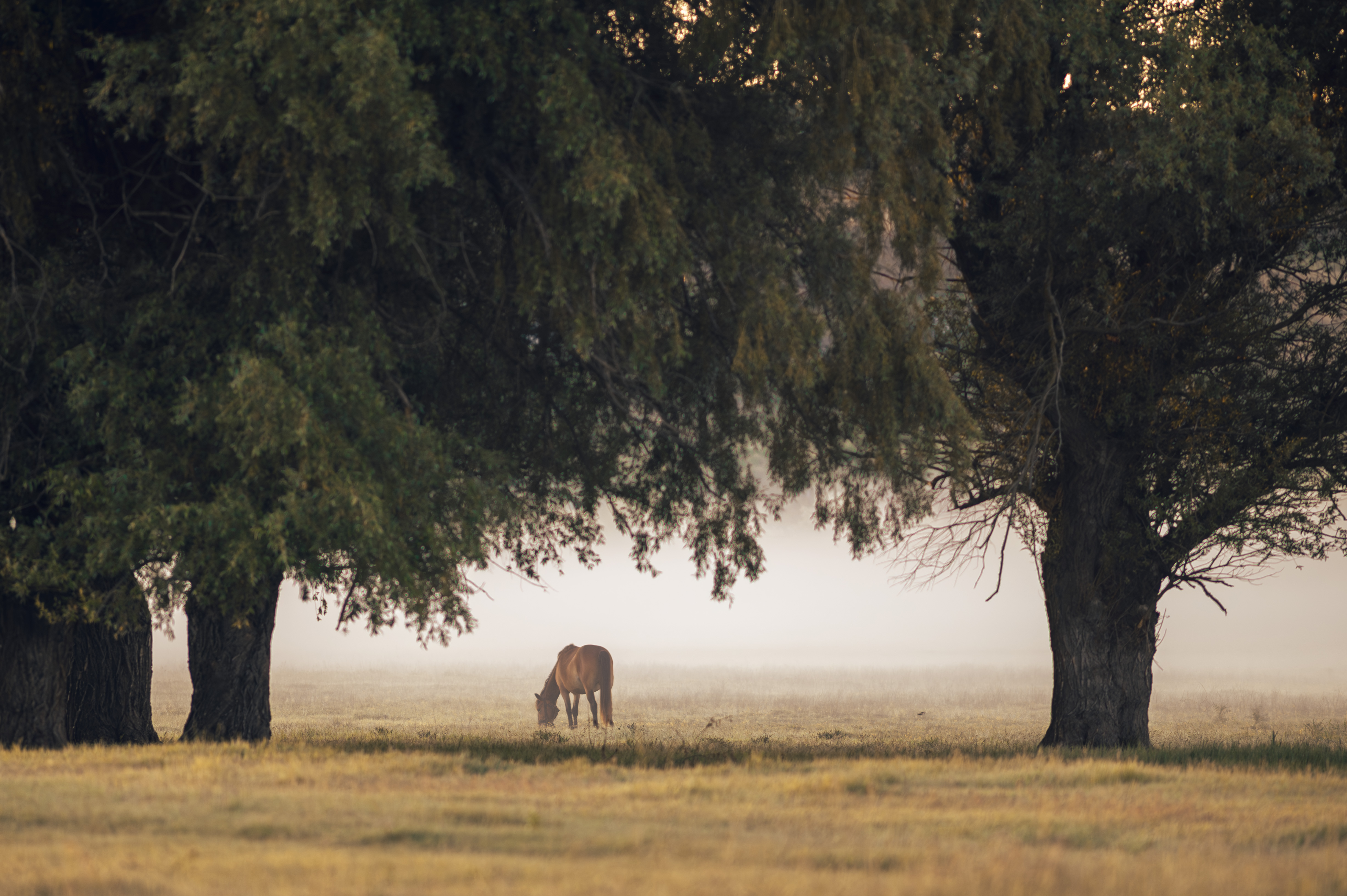 Утро ещё не проснулось. Лошадь пасётся в туманной долине, скрытой под тяжёлыми кронами деревьев. Мягкий свет, спокойствие и почти медитативная пауза природы.