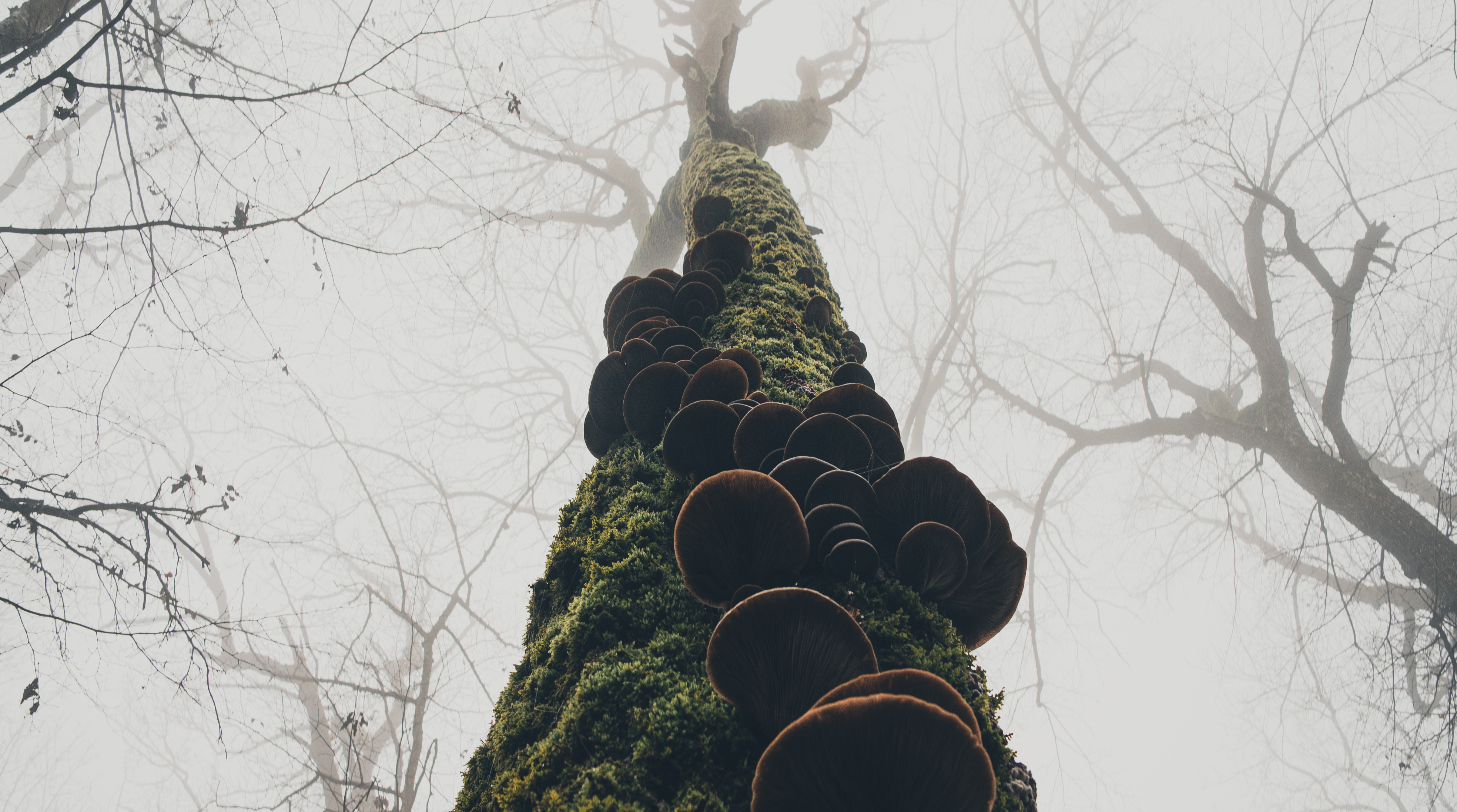 Взгляд вверх. Туманное утро в лесу обнажает геометрию природы. Старый ствол, покрытый мхом и грибами-трутовиками, уходит в молочную дымку, создавая ощущение бесконечности и покоя. Нижний ракурс.