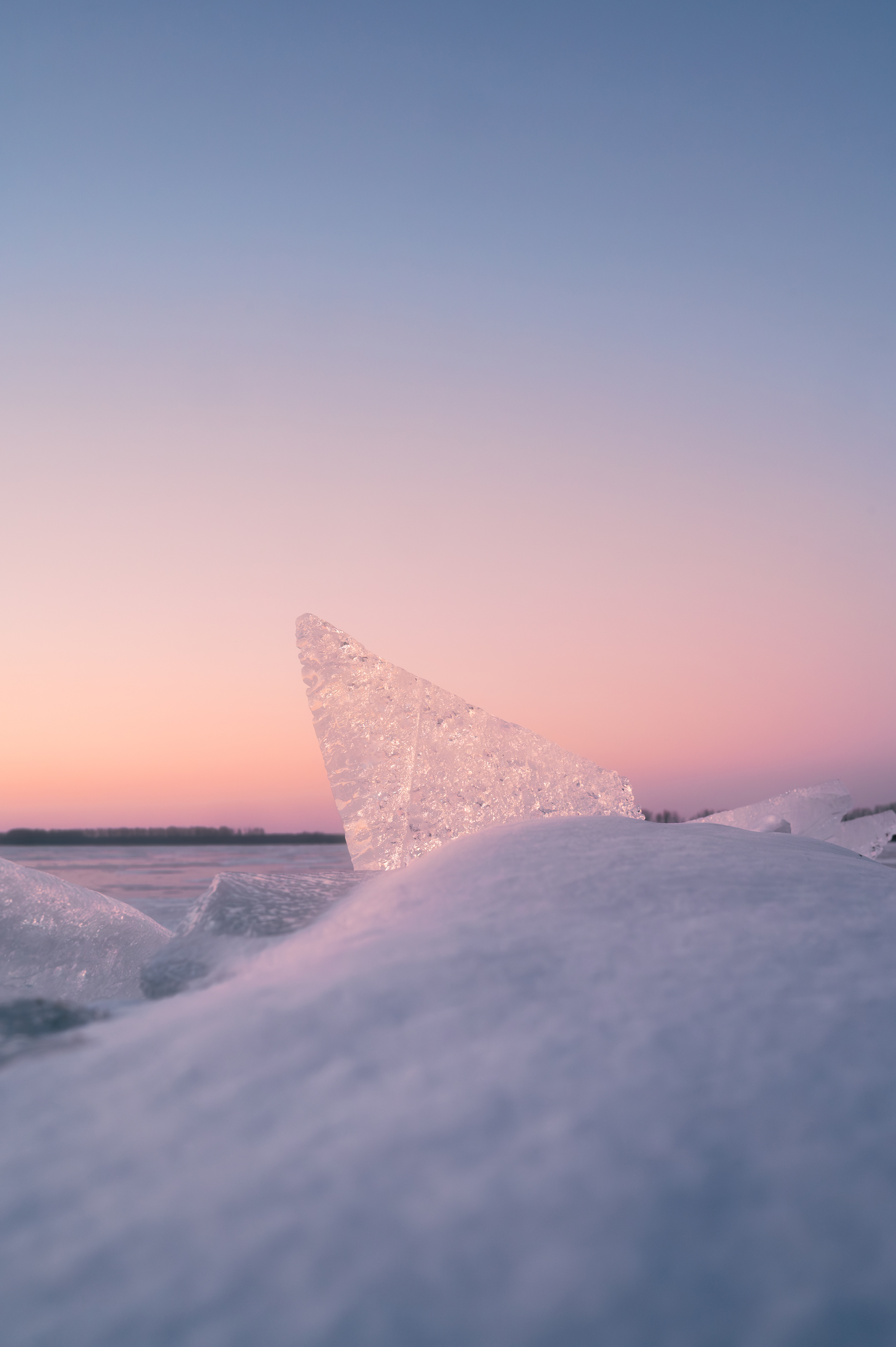 Первый свет рассвета окрашивает лёд в розовые и голубые оттенки, а одинокий кристалл поднимается над снегом, словно парус в безветрии. Момент абсолютной тишины и хрупкости зимы.