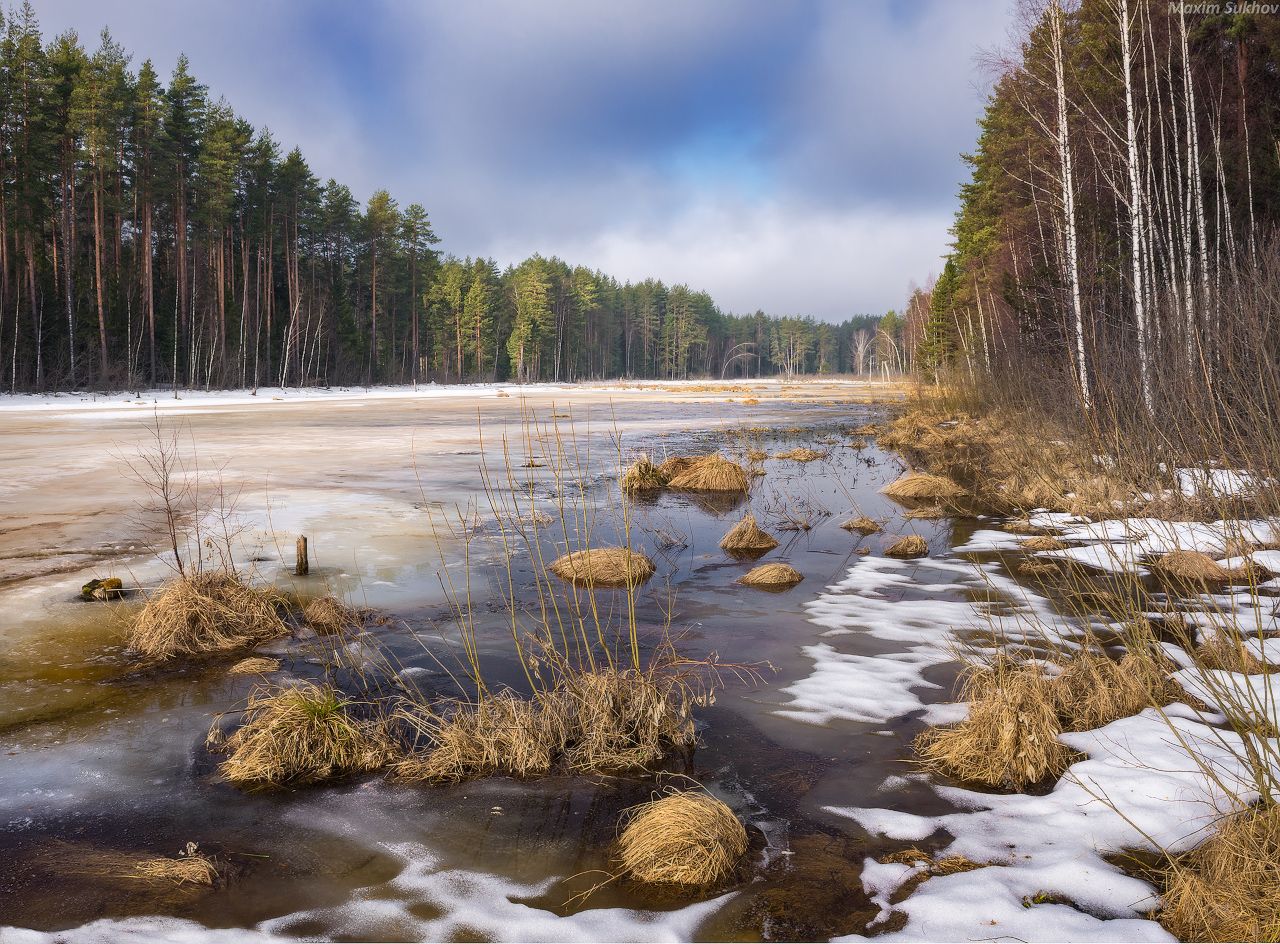 река, лед, лес, сосны, весна, Максим Сухов