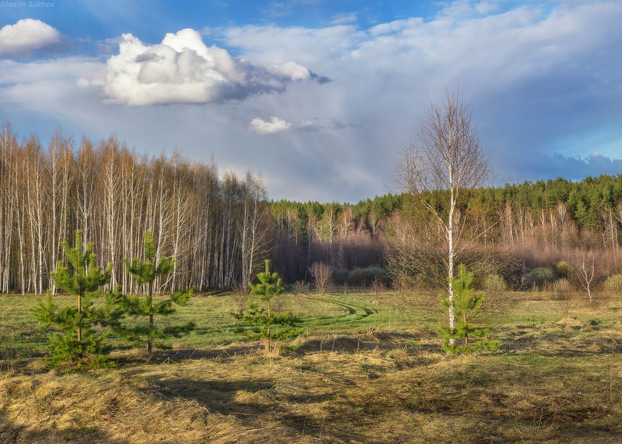 весна, березы, сосны, апрель, дорога, луг, облака, зелень, Максим Сухов