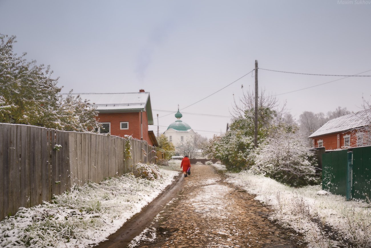 церковь, храм, утро, снег, первый снег, дорога, улица, деревня, камни, Максим Сухов