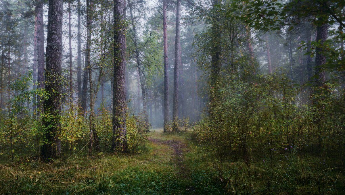 лес, сосны, тропинка, утро, туман, дымка, осень, Максим Сухов