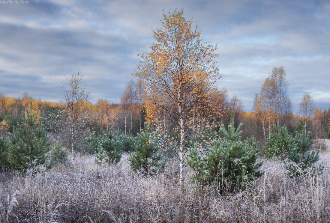 озеро, трава, осень, заморозки, утро, холод, иней, тучи, Максим Сухов
