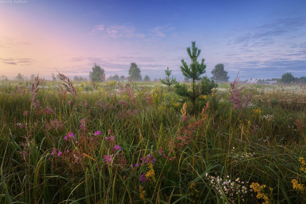 туман, рассвет, утро, полевые цветы, поле, луг, облака, деревня, ель, елочка, Максим Сухов