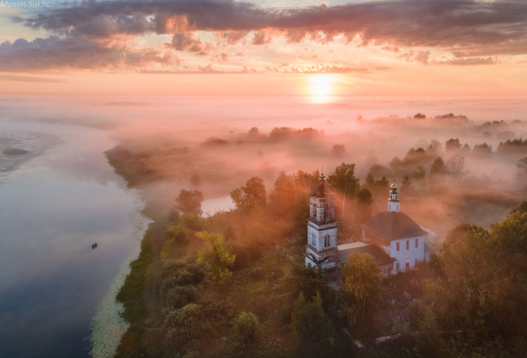 храм, туман, утро, вязники, рассвет, облака, август, лодка, озеро, церковь, деревья, поля, река, Максим Сухов