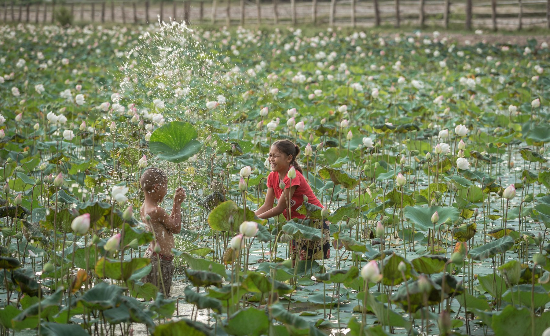 lotus flower; lotus; flower; pond; girl; boy; happy; time; playing; people; thai; thailand; kids; young; asia; , SUTIPORN SOMNAM