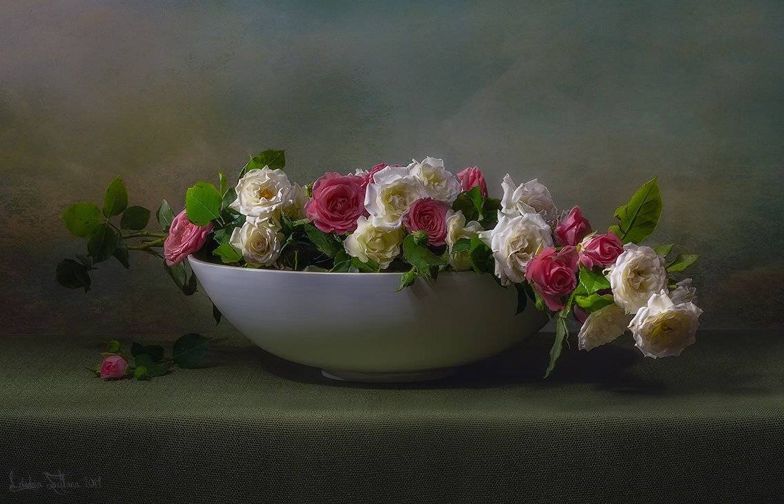 Вот только вчера сидела и думала, какой бы красивый натюр сделать с розами - у меня в саду растут, скоро уж все отцветут, а так ничего путнего и не пришло в голову ... А тут - такая красота и всё просто! Молодчинка - очень понравились работы.Последняя особенно - объёмная, кокетливая и ничего лишнего.)