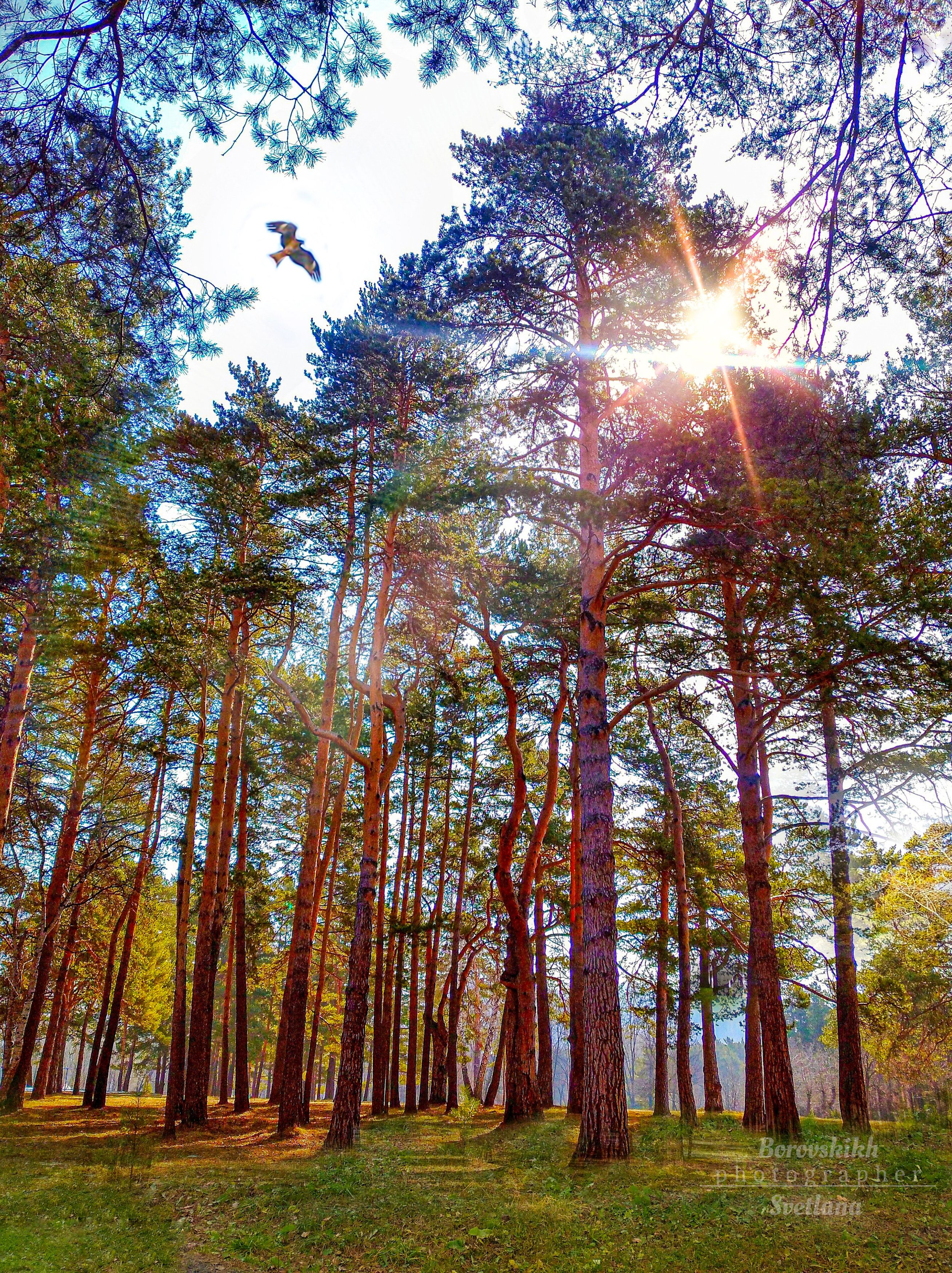 пейзаж, природа, сосновый бор, осень, коршун, солнце, утро, Светлана Боровских