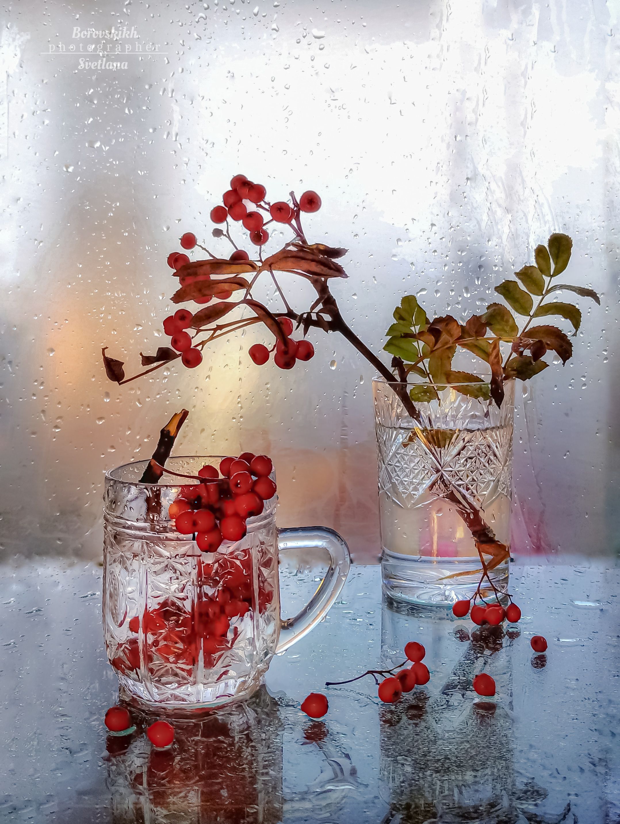 натюрморт, осень, ягода, рябина, полиэтилен, фото на окне, стекло, фото на телефон, закат, Светлана Боровских