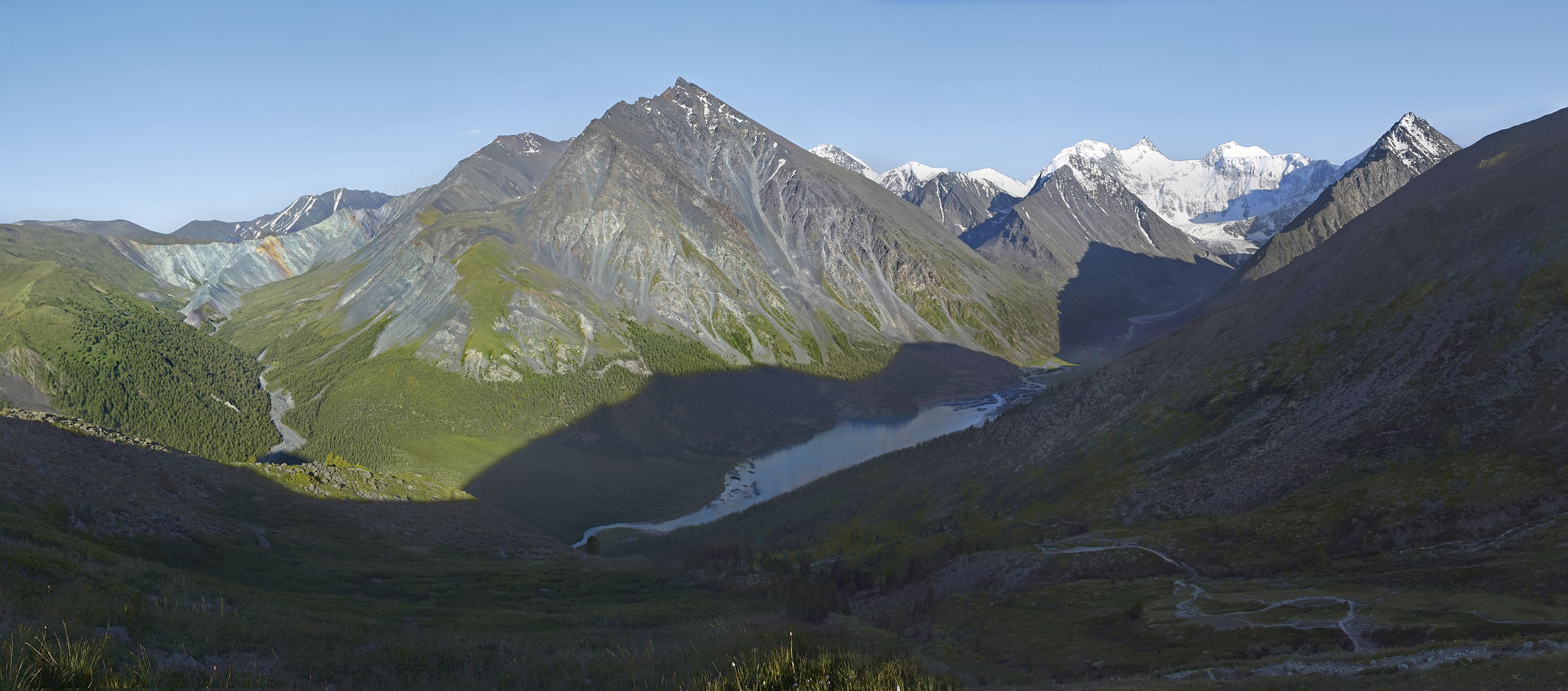 Она. Слева долина Ярлу, внизу озеро Аккем, а снято с перевала Кара-Тюрек.