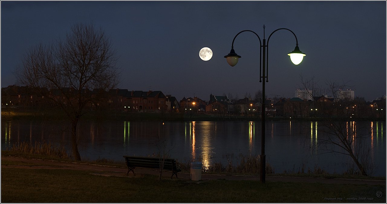 Во первых луна наверняка вшопина, а дорожка есть И цвет не совпадает. Значит она все таки там была. Второе фонарь горит, а свет от него где?Тоже вопрос.Работа хорошая и мне нравится разбирать такие работы по косточкам. Угадывать мысли автора.