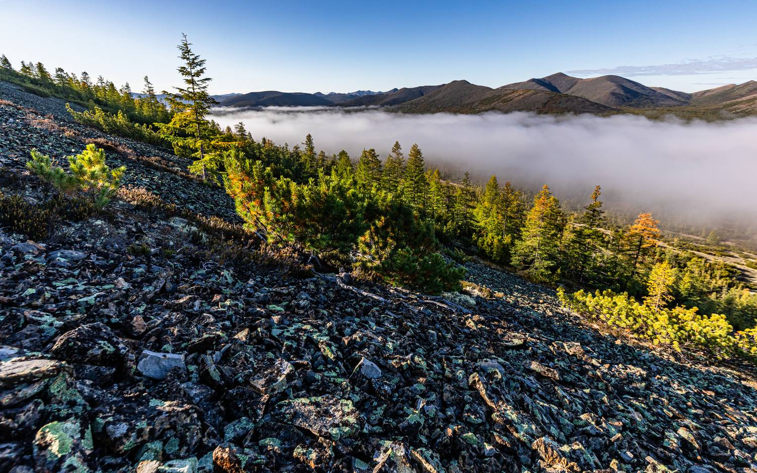 Сергей, спасибо за эти кадры — как будто сам встал на каменистый склон и вдруг увидел, как туман ложится на озеро, а солнце золотит курумник. Ощущение утра в Колыме — холодное, чистое, почти безмолвное. Особенно понравилось, как камни и хвойные вкрадчиво вписываются в пейзаж — не борются, а живут. 🌲🌫️📷