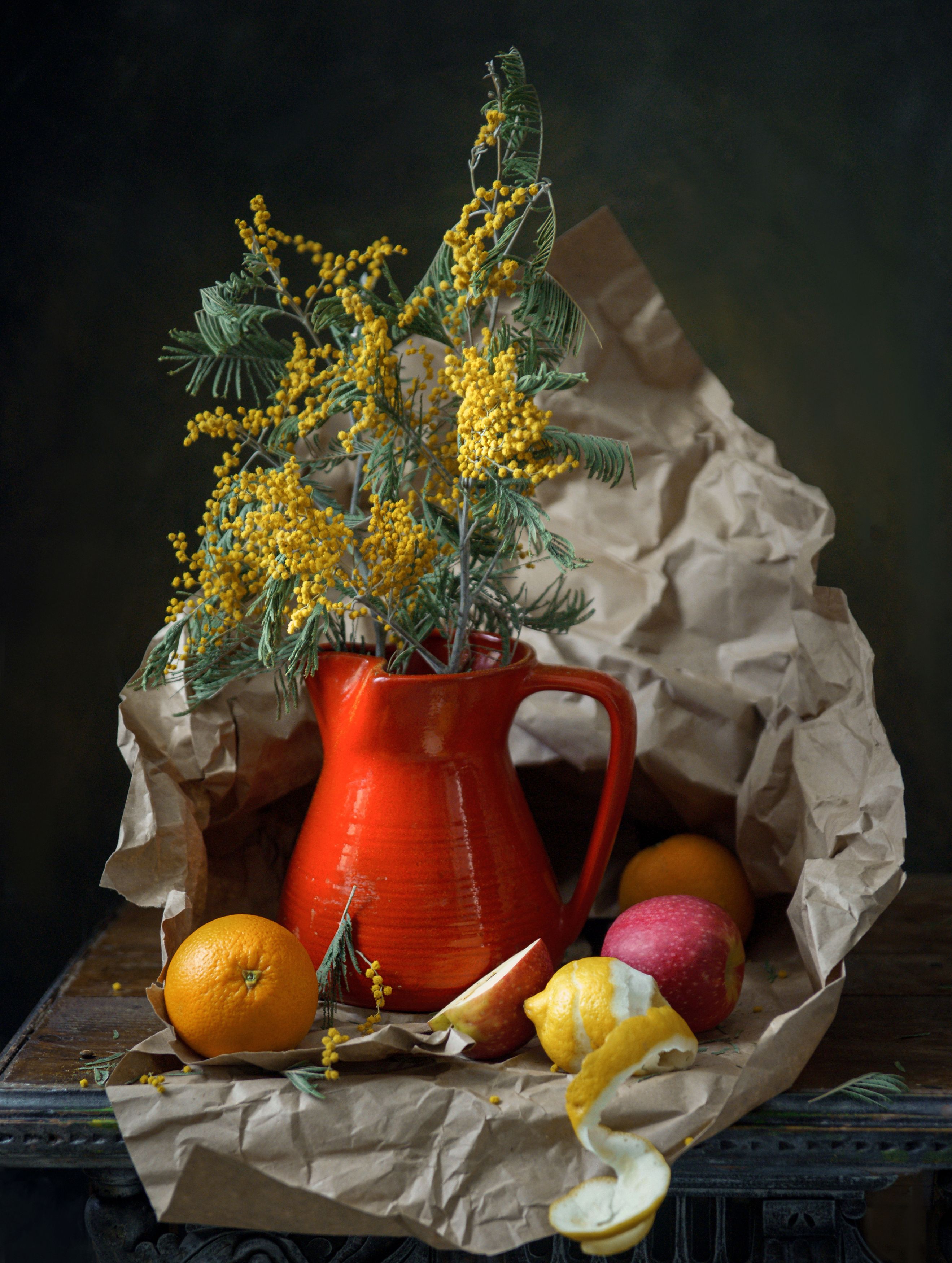 Светлана, композиция выстроена с умом — яркий красный кувшин и мимоза на тёмном фоне создают сильный контраст, а бумага и фрукты добавляют текстуры и естественности. Свет мягкий, акценты чёткие, всё выглядит целостно.