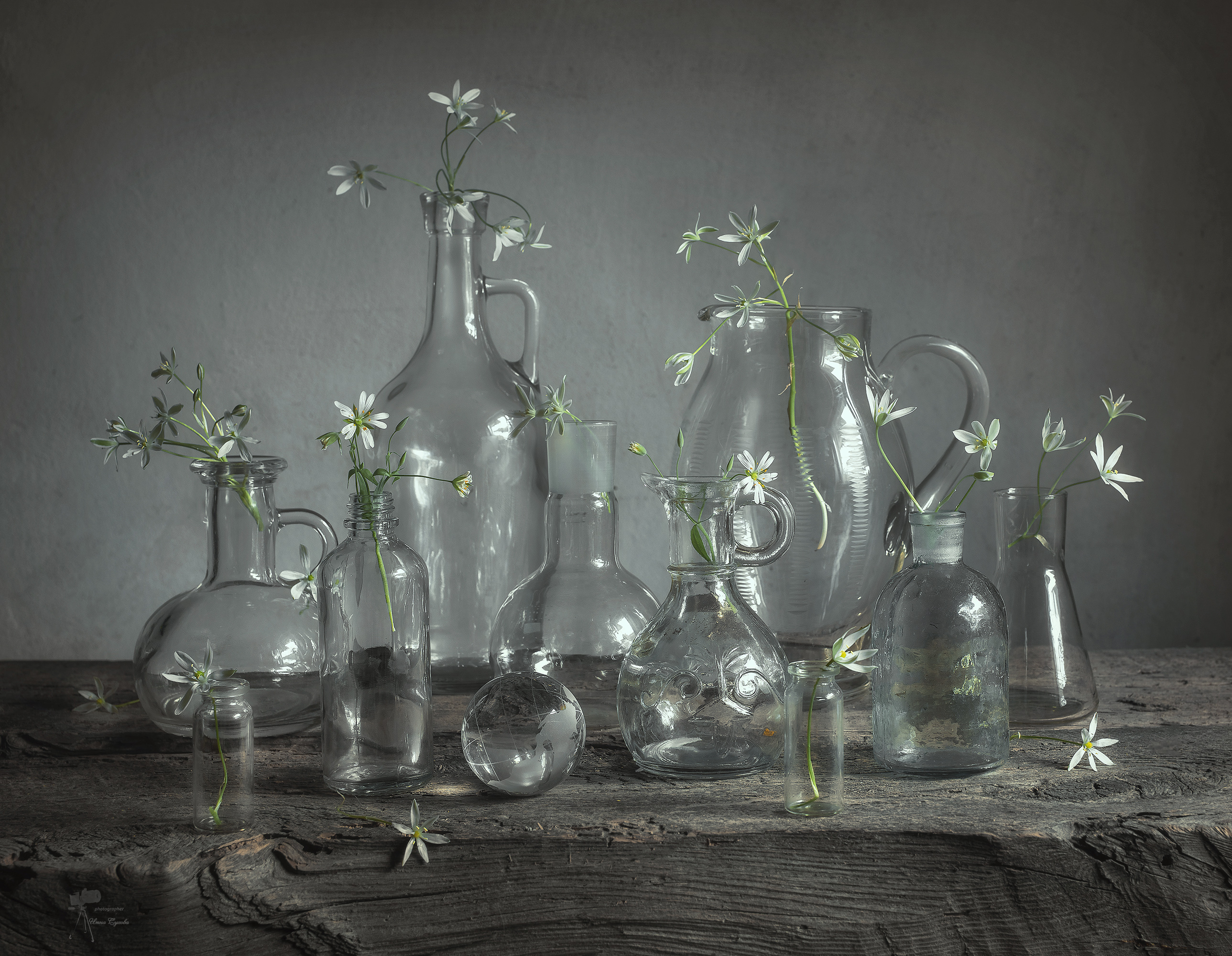 Снимок выполнен в спокойной, сдержанной цветовой гамме — серые, бежевые и прозрачные оттенки стекла создают ощущение легкости и чистоты. Композиция уравновешена: разнообразные формы бутылей и стеклянной посуды, вставленные в них нежные белые цветы, образуют естественную и гармоничную группировку. Освещение мягкое, с акцентом на текстуру стекла и древесины — это подчеркивает материал и придает снимку глубину.